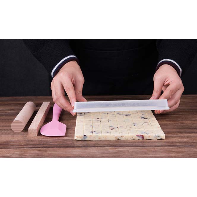 Khuôn kẹo Nougat 5 chi tiết Bộ dụng cụ giúp làm kẹo nougat dễ dàng. Viên kẹo được chia đều và đẹp mắt. Mỗi khuôn cho thành phẩm 1kg kẹo - Chất liệu: Nhựa PP Bộ sản phẩm làm kẹo nougat gồm 5 chi tiết - 1 khuôn nhựa - 1 đế chia ô. kích thước: 18.5 x 24 x 2cm, chia thành 60 viên kẹo. - 1 con lăn gỗ để cán phẳng bề mặt - 1 thanh gỗ vuông để lấy dấu - 1 tấm silicon phủ mặt kẹo khi cán #Dolambanh, #dungculambanh, #banbuondolambanh #nougot #khuonlamkeonougat #khuôn làm bánh