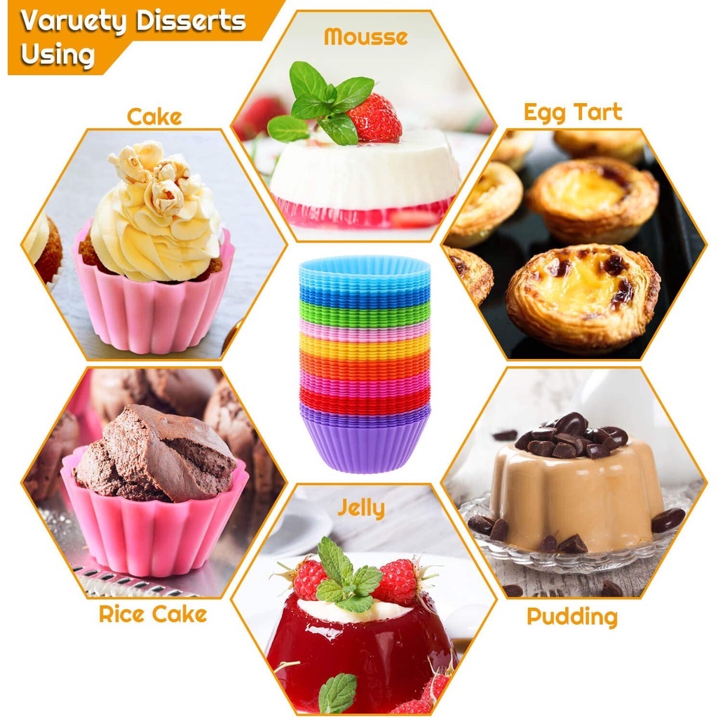 Khuôn làm bánh bằng silicon có thể tái sử dụng với màu sắc ngẫu nhiên Số lượng: 1 chiếc Đặc trưng: dễ sử dụng và vệ sinh, không vị, không độc hại, bền bỉ Thích hợp để làm bánh ngọt, bánh kem muffin, bánh kem, thạch, sô cô la, v.v. Dụng cụ nhà bếp Đảm bảo an toàn cho sức khỏe gia đình bạn! - Kích thước: Kích thước tiêu chuẩn 7 cm (đường kính) - Công suất: 2,2 Ounce