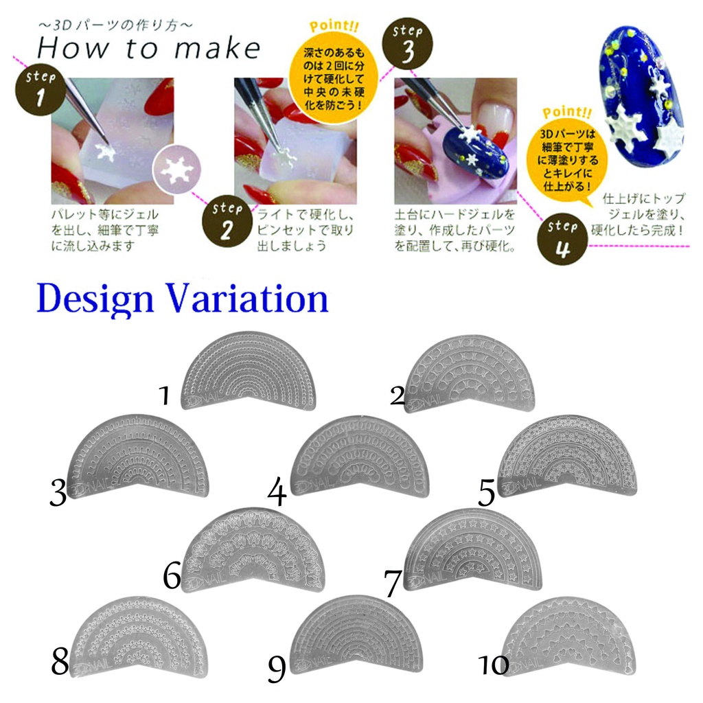Phụ kiện khuôn silicon nail tạo hình ren * Mô tả - Với khuôn silicone nghệ thuật vẽ móng này, bạn có thể tự làm kiểu móng theo ý muốn. Màu sắc có thể được kết hợp theo sở thích của riêng bạn, và phong cách cũng có thể được tự làm bằng tay. Bạn sẽ có một bộ móng độc đ