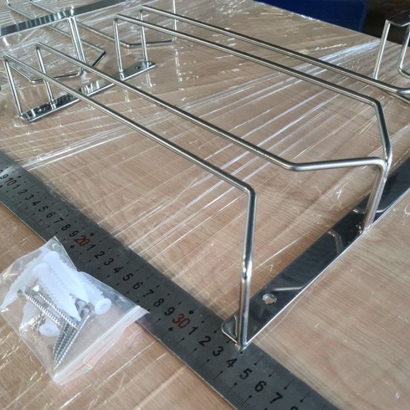 Đây là khung inox để treo ly có chân đế ly tròn . Nguyên tắc là bắt lên Trần tủ , bắt lên quầy bếp . Đưa đế ly vào khe và để xuống . Ly sẽ bị chặn lại , không sợ rớt ra . Dành cho loại ly có chân đế Bên Hưng sản xuất 3 loại : loại chiếc 1 hàng , loại đôi 2 hàng