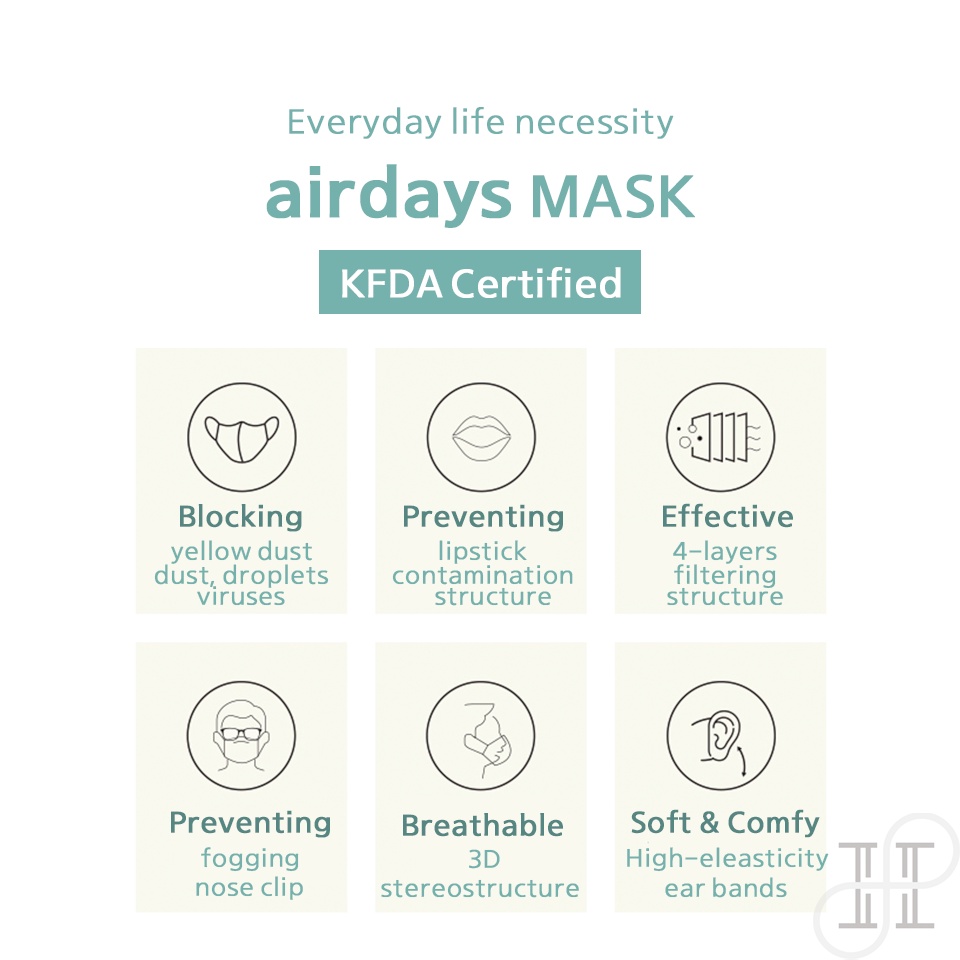 ◈ Ngày hết hạn lên đến 3 năm kể từ ngày sản xuất được in phía sau bao bì [Đặc trưng] 1. Chứng Nhận Sản Phẩm Chính Hãng 100%, Sản Xuất Tại Hàn Quốc. 2. Đạt giải thưởng "Thương hiệu tốt nhất được khách hàng lựa chọn năm 2021" tại Hàn Quốc. 3. Sản xuất 150 triệu chiếc một tháng. 4. Xuất khẩu hơn 10 triệu chiếc sang Trung Mỹ [Điểm quan trọng] 1. Được làm bằng vật liệu tương tự như KF-94. 2. Mặt nạ thoáng khí. - Hình dạng 3D và khoảng cách 3,5cm giữa miệng và mặt nạ đảm bảo thở thoải mái. 3. Kiểm tra hiệu quả lọc vi khuẩn (BFE> 99,9) đã hoàn thành. - Đã vượt qua các tiêu chuẩn nghiêm ngặt của KFDA. 4. Cấu trúc ba lớp hiệu quả. - Bộ lọc thổi tan chảy, cao cấp đã qua sử dụng. 5. Kiểm tra khả năng chống chất lỏng của bộ lọc đã hoàn thành. 6. Dây mũi và dây đeo tai thoải mái. 7. 7 màu sắc phong cách khác nhau. [Màu sắc và kích thước 1. Màu sắc: Xám nhạt, Xanh Oxford, Xanh ngọc bích, Màu be, Hoa anh đào, Tử đinh hương, Hồng san hô 2. Kích thước: - Lớn Plus: H160mm, W123mm, L180mm - Lớn: H160mm, W117mm, L180mm - Rộng Meduim: H145mm, W120mm, L165mm [Sự miêu tả] 1. Thương hiệu: airdays (Công ty: DW Bio) - Sản xuất tại Hàn Quốc 2. Sản phẩm: airdays Freestyle Color Mask