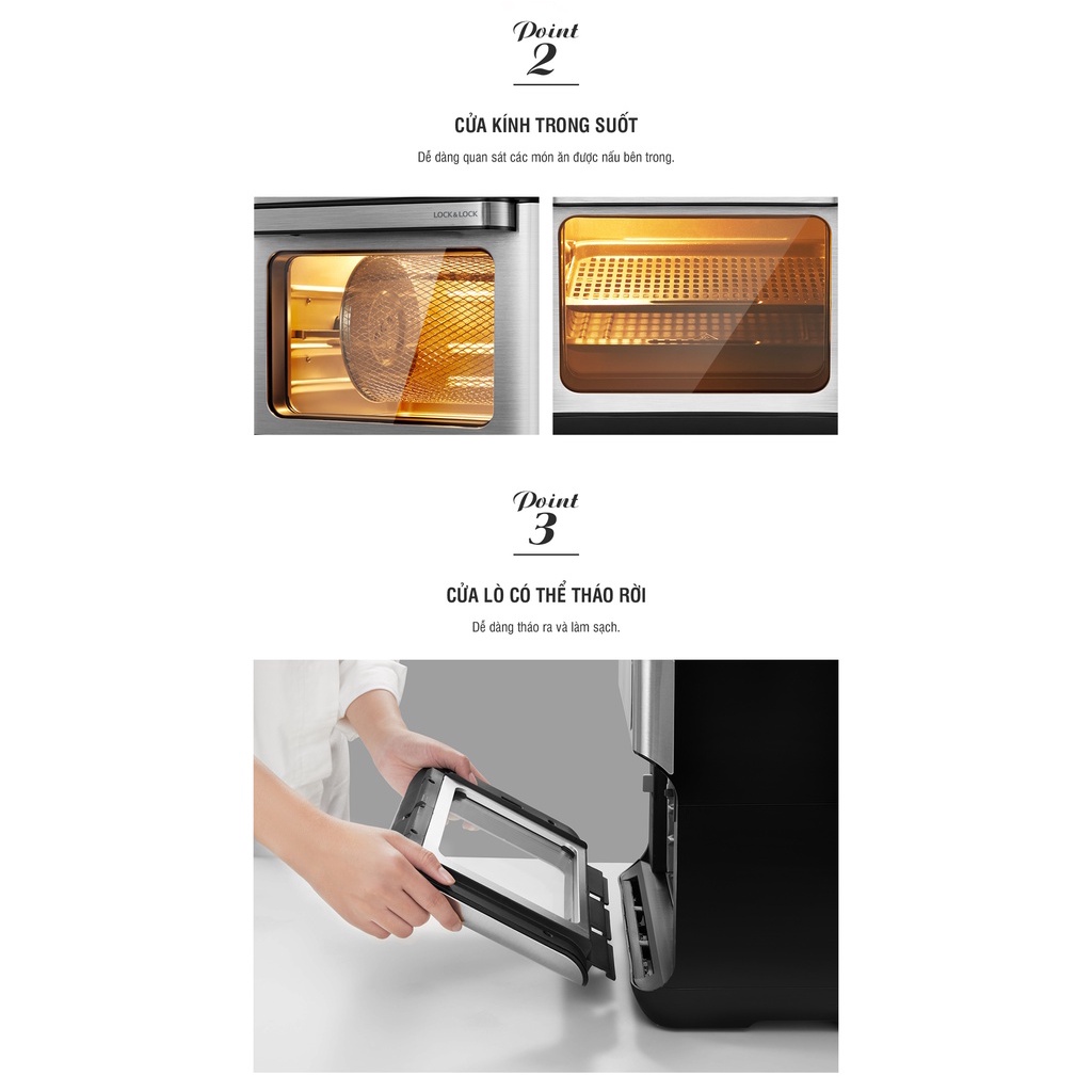 Lò nướng chân không điện tử Lock&Lock All-in-one Air Fryer Oven 10L Màu đen - EJF291BLK Chất liệu: Thép không gỉ, nhôm, nhựa PP Xuất xứ: Trung Quốc Loại sản phẩm: Lò nướng chân không Menu lò nướng: Khoai tây, Pizza, Tôm, Sườn, Cá, sấy trái cây, Đùi gà, Bánh Đặc điểm sản phẩm: - Dung tích dành cho gia đình - Dich tích lớn 10L phù hợp cho cả gia đình - Cửa kính trong suốt - Dễ dàng quan sát các món ăn được nấu bên trong - Cửa lò có thể tháo rời - Dễ dàng tháo ra và làm sạch - Màn hình cảm ứng với 8 menu mặc định - Chọn nấu món ăn một cách dễ dàng - Phụ kiện đi kèm đa dạng - Có thể nấu nhiều món ăn khác nhau - Công nghệ không khí lốc xoáy - Chiên giòn thức ăn với luồng không khí cực kỳ nóng - Để chống trượt - Giữ thiết bị ổn định trong suốt quá trình vận hành - Cấu tạo từ thép không gỉ - Bền bỉ theo thời gian Lưu ý: - Đọc kỹ hướng dẫn sử dụng trước khi sử dụng - Tránh va đập, làm rơi thiết bị, đề phòng rò rỉ điện - Vui lòng kiểm tra phích cắm trước khi sử dụng. Đảm bảo phích cắm ở tình trạng tốt để tránh điện giật - Để thiết bị xa tầm tay trẻ em và người khuyết tật - Không chạm vào bề mặt thiết bị khi thiết bị đang hoạt động để tránh bị bỏng - Không ngâm thiết bị trong nước hoặc các chất lỏng khác - Không sử dụng thiết bị ngoài trời - Cẩn thận khi di chuyển thiết bị (hoặc kéo rổ chiên ra) nếu thiết bị chứa dầu nóng hoặc các chất lỏng nóng khác Thời gian bảo hành: 24 tháng. ** Lưu ý về bảo hành: - Sản phẩm được bảo hành 24 tháng về lỗi kỹ thuật điện, không bảo hành vấn đề bong tróc, trầy xước, bể vỡ, các vấn đề về lỗi ngoại quan. - Địa điểm bảo hành: TPHCM #lock #locknlock #locklock #noicomdien #lock #lonuonglock #lonuonglocknlock #lonuong
