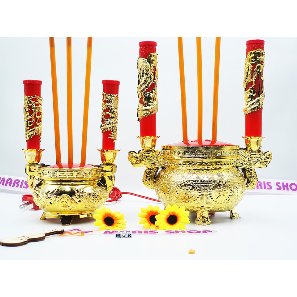 ⏩ Lư hương điện tử cao cấp sử dụng trong nhà. ⏩ Sản phẩm được xi mạ crom vàng bóng đẹp mắt, trang bị 2 cấy nến điện tử gắng bóng đèn trái ớt đẹp mắt. ⏩ Lư hương được 3 cây nhang điện tử, tạo ánh sáng tự nhiên giống như lửa nhan đang cháy ⏩ Sản phẩm gồm 2 kích thước. ⏩