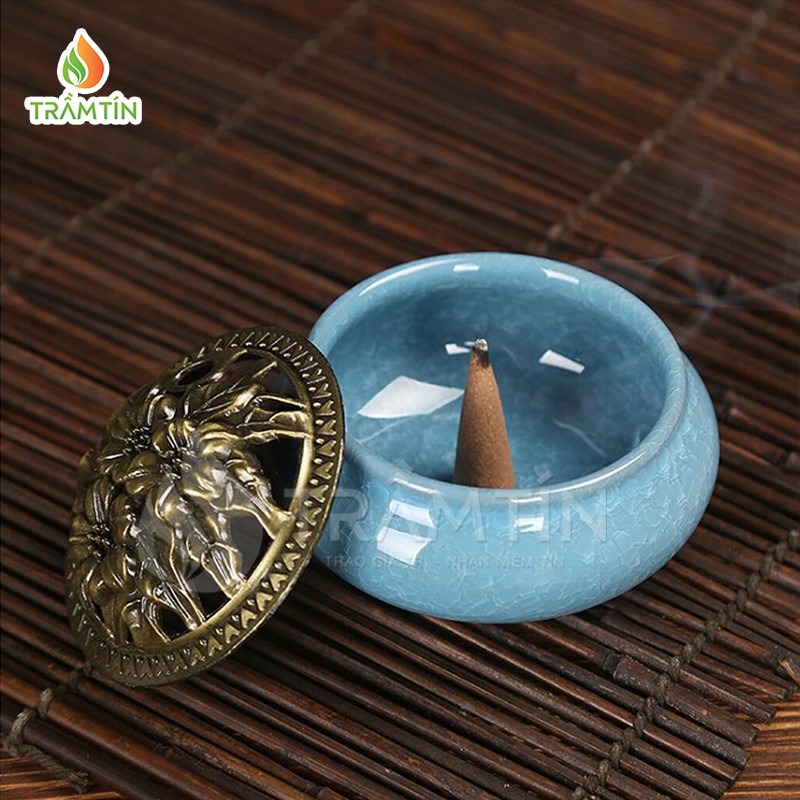 Lư sứ xông trầm hương, đỉnh đốt trầm men rạn ngọc cao cấp nhiều màu sắc, nắp đồng hoa mai. Tặng 1 nụ trầm hương Trầm Tín