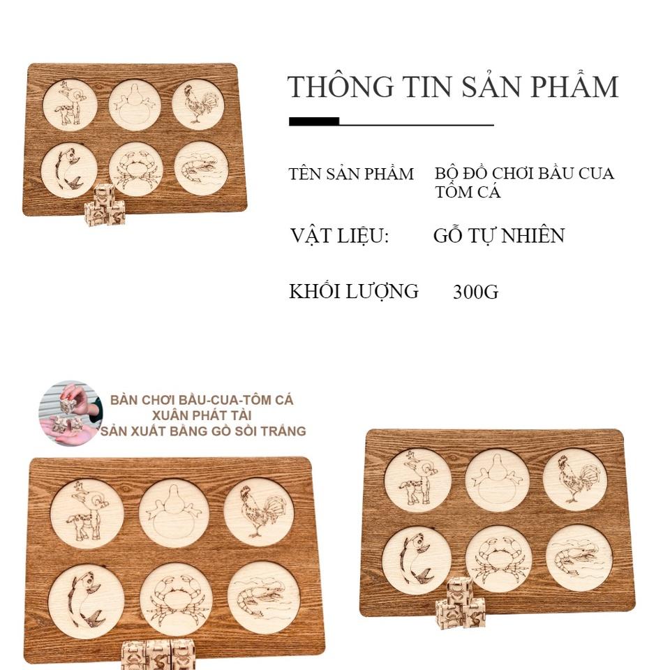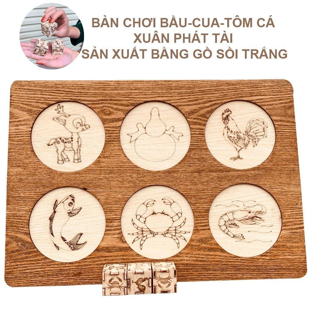 Bầu Cua Tôm Cá, Bầu Cua Tôm Cọp, trò chơi Board Game Gia Đình Vui Nhộn. Trò chơi phù hợp với cả trẻ em và người lớn. MÔ TẢ SẢN PHẨM BẦU CUA TÔM CÁ, BẦU CUA TÔM CỌP, TRÒ CHƠI NGÀY NGHỈ, DỊP LỄ TẾT: - 1 Bàn Gỗ, 3 xúc xắc bằng Gỗ - Chất liệu: Gỗ tự nhiên - Kích thước: bàn cờ 28x40cm, cục xí ngầu: 30x30mm - Xuất xứ: Việt Nam ƯU ĐIỂM SẢN PHẨM: - Bộ bầu cua tôm cá phiên bản gỗ siêu bền đẹp, mua 1 lần dùng được mãi mãi, bộ đồ chơi góp phần làm cho không khí rộn ràng, gắn kết các thành viên lại gần gũi với nhau hơn. - Trò chơi chia thành nhiều lượt và không giới hạn số lượng cũng như số lượng người chơi CÁCH CHƠI: - Dụng cụ cho trò chơi bao gồm một bàn bầu cua gồm 6 ô vẽ hình 6 linh vật theo thứ tự từ phải sang trái, trên xuống dưới là: nai, bầu, gà, cá, cua, tôm. Ngoài ra, cần 3 viên xúc xắc in hình 6 linh vật này - Nếu trong ba viên xúc xắc xuất hiện linh vật mà người chơi đã đặt,là được thắng và ngược lại Bạn hoàn toàn yên tâm khi mua hàng !#baucuatomca #dochoiboardgame #boardgame #dochoi #baucuaGiá sản phẩm trên Tiki đã bao gồm thuế theo luật hiện hành. Bên cạnh đó, tuỳ vào loại sản phẩm, hình thức và địa chỉ giao hàng mà có thể phát sinh thêm chi phí khác như phí vận chuyển, phụ phí hàng cồng kềnh, thuế nhập khẩu (đối với đơn hàng giao từ nước ngoài có giá trị trên 1 triệu đồng).....