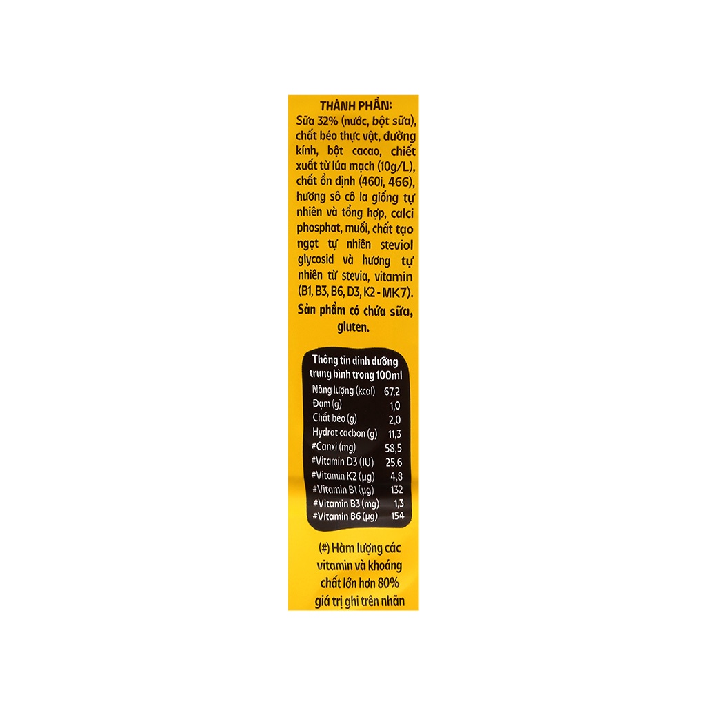 Sữa socola, lúa mạch LOF Malto là dòng sản phẩm mới kết hợp từ sữa lúa mạch và socola thơm ngon giàu vitamin B, canxi và K2, cung cấp dồi dào năng lượng. Lốc 6 chai sữa lúa mạch hương socola LOF Malto 240ml thơm ngon tự nhiên, không chất bảo quản, không màu tổng hợp và không chất tạo ngọt. Hương vịSocola Phù hợpTrẻ trên 9 tuổi và thanh thiếu niên Thể tích240ml/ chai Thành phầnSữa 32 % (nước, bột sữa), chất béo thực vật, đường kính, bột cacao, chiết xuất từ lúa mạch (10g/L), chất ổn định (460i, 466), hương sô cô la giống tự nhiên và tổng hợp, calci phosphat, muối, chất tạo ngọt tự nhiên steviol glycosid và hương tự nhiên từ stevia, vitamin B1, B3, B6, D3, K2-MK7). Sản phẩm có chứa sữa, gluten. Năng lượng67,2 kcal/ 100ml Cách dùngLắc đều trước khi uống. Dùng từ 1- 2 chai mỗi ngày. Sản phẩm cho 1 lần sử dụng. Ngon hơn khi uống lạnh. Hiện tượng thay đổi màu và lắng đọng tự nhiên không làm ảnh hưởng đến chất lượng sản phẩm. Bảo quảnNơi khô ráo thoáng mát, tránh ánh nắng trực tiếp Thương hiệuLOF (Việt Nam) Sản xuất tạiViệt Nam