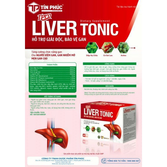 công dụng: giải độc gan, bảo vệ gan, tăng cường chức năng gan trong các trường hợp viêm gan, xơ gan, men gan cao,gan nhiễm mỡ, người uống nhiều rượu bia, sử dụng hóa chất và thuốc. thành phần: cao Diệp hạ châu......300mg cao actiso..................200mg cà gai leo...................200mg L_arginin HCl.............200mg vitamin PP ................5mg vitamin B1..................1,5mg vitamin B2...................1,5mg vitamin B6...................1,5mg cách dùng: người lớn và trẻ trên 12 tuổi : uống sáng 1viên, tối 1 viên. 6_12 tuổi : uống ngày 1 viên chú ý: sản phẩm này không phải là thuốc, không có tác dụng thay thế thuốc chữa bệnh.
