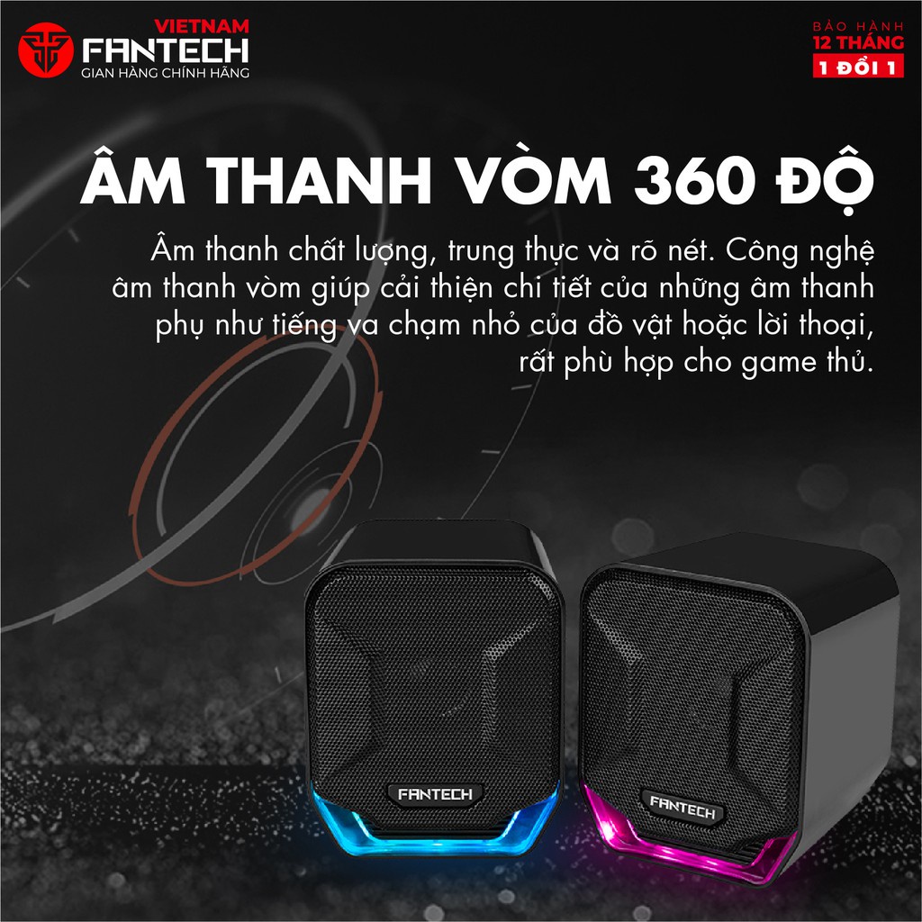 Loa vi tính Gaming siêu gọn nhẹ Fantech GS202 SONAR LED RGB Đẹp Mắt Hãng Phân Phối Chính Thức THỜI GIAN GIAO HÀNG SIÊU TỐC ĐỘ - Đơn giao hỏa tốc: Thời gian từ 1-3 giờ sau khi xác nhận đơn. - Đơn giao bình thường: Thời gian từ 1-3 ngày sau khi xác nhận đơn. TÍNH NĂNG: - Âm thanh vòm 360 độ: GS202 SONAR cho chất lượng âm thanh chất lượng, trung thực và rõ nét. Công nghệ âm thanh vòm giúp cải thiện chi tiết của những âm thanh phụ như tiếng va chạm nhỏ của đồ vật hoặc lời thoại, rất phù hợp cho game thủ. - Đèn LED RGB: Tích hợp công nghệ RGB thông minh cho phép tùy chỉnh ánh sáng 16.8 triệu màu, gia tăng trải nghiệm chơi game. - Loa thiết kế với dạng loa đôi, kiểu dáng và màu sắc trang nhã, dễ dàng kết nối với các thiết bị âm thanh. Loa dùng cổng USB làm nguồn và jack 3.5 kết nối PC có thể sử dụng được ngay khi mở hộp không cần cài đặt. - Loa có trọng lượng nhẹ, nhỏ gọn giúp người dùng dễ dàng thay đổi vị trí, di chuyển. - Kiểu dáng đơn giản, sang trọng. CHÍNH SÁCH BẢO HÀNH - Bảo hành chất lượng sản phẩm 12 tháng. Với phương châm quyền lợi của khách hàng là quan trọng nhất, Fantech Việt Nam xây dựng chính sách đổi trả dành cho khách hàng như sau: - Trong vòng 15 ngày đầu sau khi mua hàng. - Tất cả các sản phẩm tuân theo điều khoản bảo hành tại thời điểm xuất hóa đơn cho khách hàng. ĐỊA CHỈ TRUNG TÂM BẢO HÀNH: - HCM: Số 19/14 Hồ Văn Huê, Phường 9, Phú Nhuận, HCM Hotline: 0912 334 833 Thời gian làm việc: 8h - 17h30 (Thứ 2 -Thứ 7). --------------------------------------------------- THÔNG TIN THƯƠNG HIỆU Fantech là thương hiệu thiết bị phát triển nhanh nhất thế giới dành cho game thủ. Fantech chuyên tâm vào chế tạo và phát triển các sản phẩm hướng tới game thủ PC như laptop chơi game, phụ kiện máy tính, thiết bị ngoại vi máy tính chơi game khác nhau, thiết bị đeo và phụ kiện. - Thành lập: Năm 2009 - Trụ sở: Indonesia. ZACOM VIỆT NAM - Phân phối chính thức sản phẩm �Fantech tại Việt Nam - Tên đầy đủ :Công Ty TNHH ZACOM VIỆT NAM - Địa chỉ: 19/14 Hồ Văn Huê, Phường 09, Quận Phú Nhuận, Thành phố Hồ Chí Minh, Việt Nam. - Điện thoại: 0912 334 833