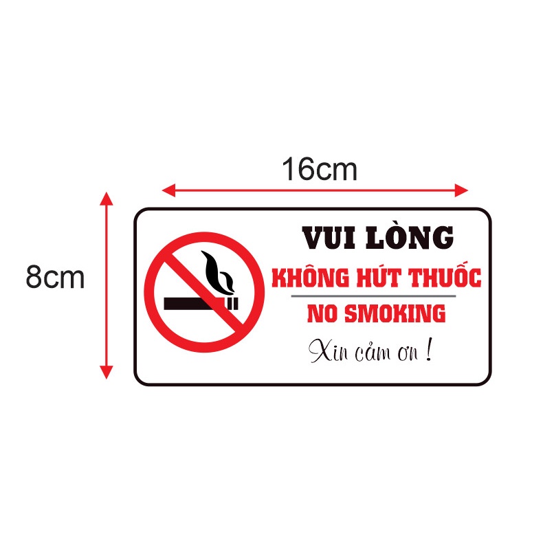 LOGO KHÔNG HÚT THUỐC Việc thực hiện môi trường không khói thuốc là một phần quan trọng để bảo vệ quyền được sống trong môi trường trong lành của những người không hút thuốc, giúp giảm nguy cơ bệnh tật và tử vong do tiếp xúc thụ động với khói thuốc. Đặc biệt là việc hút thuốc trong xe hay trong không gian nhỏ sẽ gây ra sự khó chịu gấp bội phần, khói thuốc sẽ ám vào các phần nội thất của xe khiến không gian xe lúc nào cũng có mùi thuốc. Sản phẩm logo không hút thuốc là một lời nhắc nhở cho các hành khách có ý định hút thuốc trên xe, hay bất kỳ nơi nào không được phép hút thuốc. Sản phẩm với chi phí rất nhỏ, nhưng tác dụng lan tỏa cộng đồng lại rất lớn. Sử dụng đơn giản, chỉ bóc lớp bảo vệ và dán vào bất cứ nơi nào bạn muốn. Thông tin về sản phẩm: Số lượng: 01 logo. Kích thước: 15x8cm.
