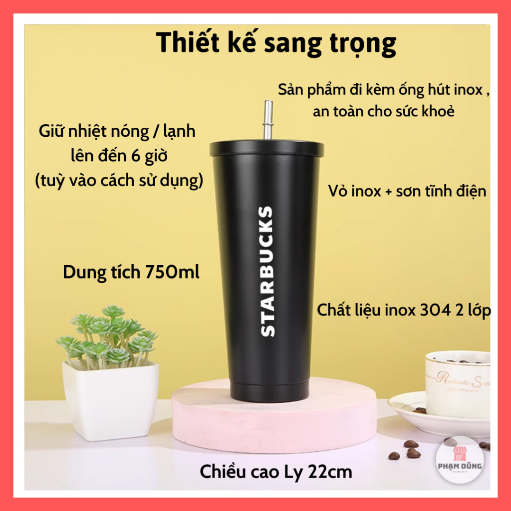 Ly giữ nhiệt starbucks 750ml inox 304 kèm ống hút inox, bình giữ nhiệt nóng lạnh 6 giờ thiết kế sang trọng làm quà tặng