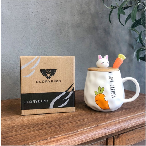 Ly sứ có nắp hình thỏ dễ thương 400ml, cốc uống nước có quai kèm thìa carrot