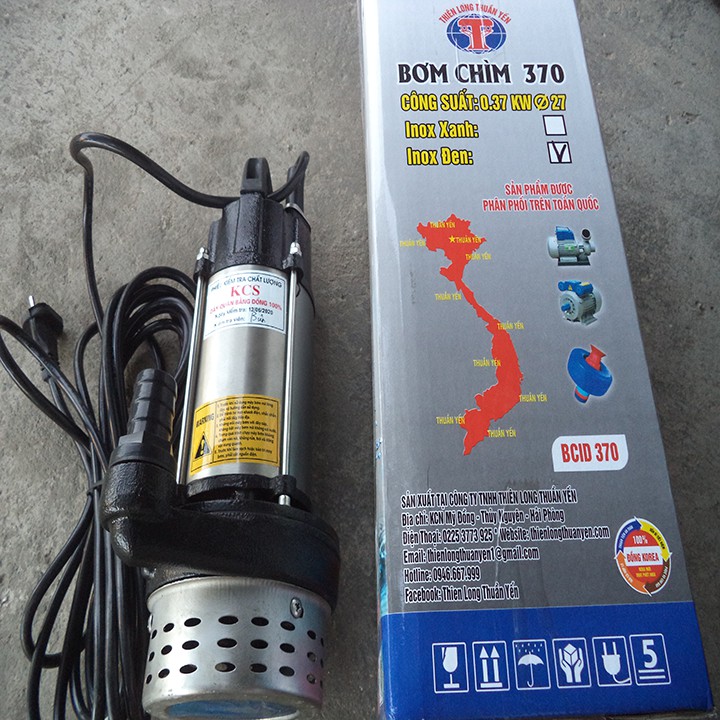 Máy bơm nước chìm,máy bơm nước tõm 370 inox thiên long thuận yến Sử dụng để cấp nước cho khách sạn,phòng ăn và nhà cao tầng,cho tưới tiêu dất trồng,cho cấp thoát nước công nghiệp,để tưới cây. Điện áp: 220-240V~50Hz Công suất: 370W Chiều cao bơm tối đa: 12M Tốc độ dòn