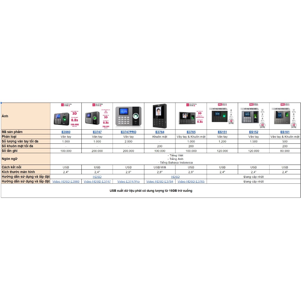 MÁY CHẤM CÔNG DELI CHÍNH HÃNG CAO CẤP THÔNG SỐ CÁC MẪU MÁY ĐẶC ĐIỂM SẢN PHẨM: - Lưu trữ dữ liệu lên tới 1,500 vân tay và 200 gương mặt - Số lần ghi lên tới 200,000 lần - Có thể thay đổi các ca làm việc khác nhau, phù hợp, doanh nghiệp với các tổ chức có nhiều ca làm việc. - Máy có thể quét khi bàn tay đang khô hoặc ướt. - Không cần phải cài đặt phần mềm khác - File excel báo cáo thông minh, dễ dàng xử lý - Dễ dàng lắp đặt, sử dụng - Thân máy được làm bằng chất liệu nhựa ABS - Xuất dữ liệu bằng USB từ 16GB trở xuống - Hỗ trợ các ngôn ngữ: Tiếng Việt, Tiếng Anh, Tiếng Trung, Tiếng Indonesia ------------------------------------------------------------------------------------------------------------------------------------------------------------ Deli Office Accessories Store - Cửa hàng độc quyền sản phẩm tại Việt Nam Ngoài cung cấp các sản phẩm văn phòng phẩm, Deli còn cung cấp các sản phẩm thiết bị, máy móc hỗ trợ cho việc tối ưu hóa hiệu quả làm việc cho doanh nghiệp. Với phương châm luôn luôn thấu hiểu khách hàng và cung cấp các giải pháp hoàn thiện hóa và trải nghiệm mới thông qua sự đổi mới không ngừng, do đó giúp khách hàng doanh nghiệp của Deli gia tăng năng suất và hiệu quả chính xác hơn. Khách hàng lựa chọn các sản phẩm của Deli Office Accessories sẽ được cam kết: Sản phẩm chính hãng từ nhà máy Deli, nguồn gốc rõ ràng và chất lượng đạt tiêu chuẩn. Các sản phẩm được nghiên cứu, trải qua quá trình thử nghiệm nghiêm ngặt tại nhà máy Deli. Bảo hành theo quy định của nhà sản xuất. Giá cả hợp lý, cạnh tranh. Hỗ trợ đổi trả hàng cho những sản phẩm bị thiếu.