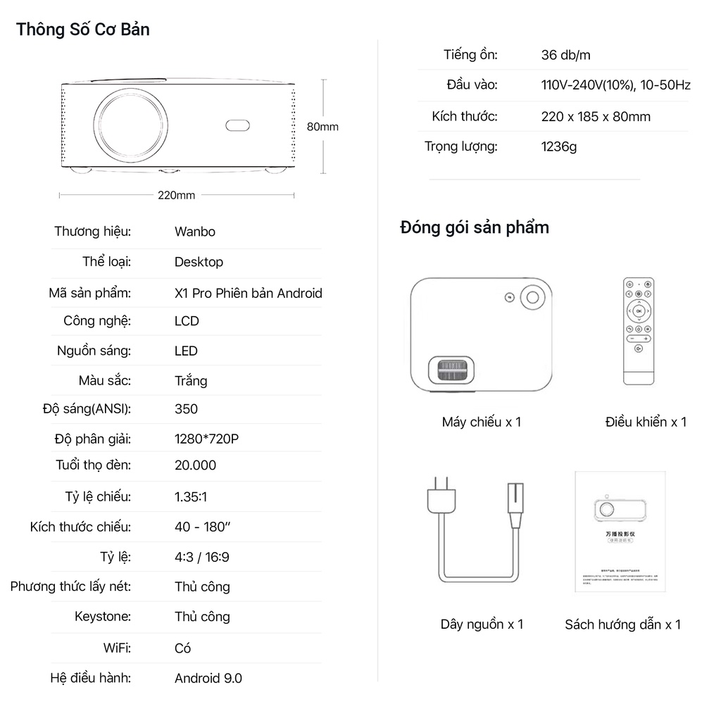 Máy chiếu thông minh Wanbo X1 Pro sử dụng Android 9.0 / 1GB RAM - Hiệu chỉnh Keystone / Rạp phim tại nhà