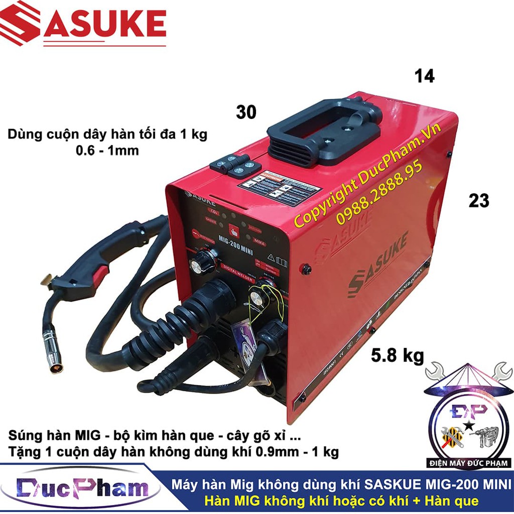 Điện Máy Đức Phạm chuyên phân phối hàng chính hãng 4. Tên sản phẩm : Máy hàn Mig mini không dùng khí Sasuke MIG-200 MINI - 3 chức năng 5. Bảo hành : 12 tháng ( miễn phí ) - Bảo hành dịch vụ trọn đời – Có tất cả linh kiện thay thế 6. Dòng máy hàn Mig mini không dùng khí xách tay với khối lượng nhỏ nhẹ nên rất tiện lợi cho người sử dụng có thể di chuyển, mang vác, làm việc trên cao. 7. Tiêu thụ điện năng thấp hơn, có thể tiết kiệm năng lượng trên 50% so với hàn mig thông thường. 8. THÔNG SỐ KỸ THUẬT: Dòng điện 200A, Hàn có khí và không khí với dây hàn 0.8 - 1mm ( Cuộn dây 0,5 - 1 kg ) 9. Hàn que 2.6 - 3.2 mm . Phụ kiện đi kèm gồm có kiềm hàn, kẹp mass, súng hàn, cuộn dây 0.9mm - 0.5kg , mặt nạ , dây đeo và búa sỉ. 10. Phụ kiện Bao gồm : Súng hàn Mig , kìm hàn , kẹp mass , cây gõ xỉ , ... Tặng 1 cuộn dây hàn tẩm lõi thuốc 0.9mm ( 1 kg )