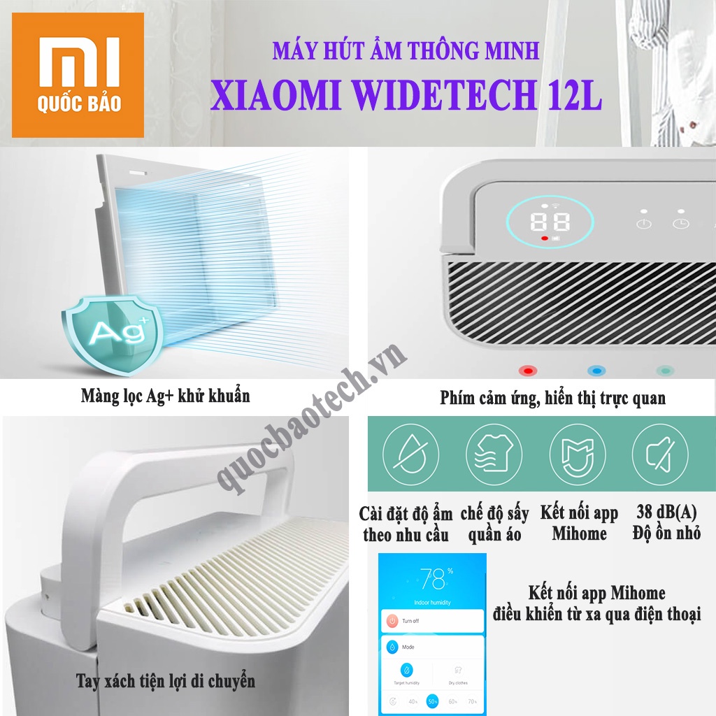 Máy hút ẩm thông minh Xiaomi New Widetech 12L, 18L - kết nối App Mihome Thông số sản phẩm: Model: New Widetech 12L Kết nối Mihome Hiệu điện thế định mức: 220V Tần số: 50Hz Công suất định mức: 165W Độ hút ẩm định mức: (ở môi trường 30 độ C và độ ẩm 80%) 12L / ngày Độ hút ẩm (20 ℃ và độ ẩm 60%) 0.4kg / giờ Điều chỉnh độ ẩm: Rh40%, rh50%, rh60% Độ ồn: 38 db (A) Dung tích bể chứa nước: 2.2L Thời gian hẹn giờ: 12 giờ (Chỉ APP) Khu vực ứng dụng: 5-25m2 Vật liệu vỏ: Nhựa ABS Màu sắc: Trắng Cân nặng: 9.7Kg Kích thước: 305 x 467 x194mm ---------------------------------------------------------------- Model: New Widetech 18L Tần số: 50Hz Công suất: 240W Độ ẩm định mức (30oC80%): 18L / ngày Độ ẩm danh nghĩa (20 ℃ RH60%): 0.4kg / h Điều chỉnh độ ẩm: Rh40%, rh50%, rh60% Độ ồn: 38 db (A) Dung tích bình chứa nước: 2.7L Thời gian 24 giờ (Chỉ APP) Khu vực sử dụng: 5-40 m2 Chất liệu: Nhựa ABS Màu sắc: Trắng Cân nặng: 11.3 kg Kích thước: 334 x 220 x 470 mm Không khí ẩm gây nên các mùi hôi ẩm mốc khó chịu, lâu dần làm ảnh hưởng đến đồ dùng nội thất trong nhà cũng như tác động nghiêm trọng đến tình trạng sức khỏe của cả gia đình. Máy hút ẩm thông minh NEW WIDETECH chính là giải pháp thiết thực nhất mà bạn cần đầu tư cho ngôi nhà của mình để có thể khắc phục hiệu quả các vấn đề trên một cách nhanh chóng, từ đó mang đến bầu không khí khô ráo và thoáng đãng hơn cho gia đình Ưu điểm của máy - Hút ẩm công suất cao, nhanh chóng làm khô mặt sàn - Có thể dùng để sấy quần áo - Có bộ lọc Ag+ giúp kháng khuẩn và diệt khuẩn trong không khí - Độ ồn cực thấp, chỉ 38db và gần như không có tiếng kêu của máy - Có thể kết nối wifi với ứng dụng Mihome để điều khiển từ xa . Máy hút ẩm thông minh NEW WIDETECH với khả năng kiểm soát chính xác và hút ẩm liên tục giúp ngăn ngừa tình trạng ẩm ướt hiệu quả, đồng thời giữ cho không gian luôn được khô ráo và thoáng đãng, đặc biệt là ức chế sự phát sinh của vi khuẩn nấm mốc gây mùi, từ đó mang lại bầu không khí tươi mát cho cả gia đình. Bên cạnh đó, sản phẩm còn được trang bị một loạt các chế độ điều chỉnh độ ẩm để duy trì độ ẩm lành lạnh, thoải mái trong tất cả các mùa, đáp ứng mọi nhu cầu sử dụng độ ẩm khác nhau của người dùng. Ngoài ra, thiết bị còn có thể được sử dụng ngay cả trong môi trường có nhiệt độ thấp ≥ 5°C. Xiaomi Quốc Bảo Đà Nẵng- Hotline: 0934 950 011 Showroom: 240 Lê Văn Hiến, P Khuê Mỹ, Q Ngũ Hành Sơn, TP Đà Nẵng #mayhutamxiaomi #mayhutam #newwidetech #hutamxiaomi #hutamnewwidetech