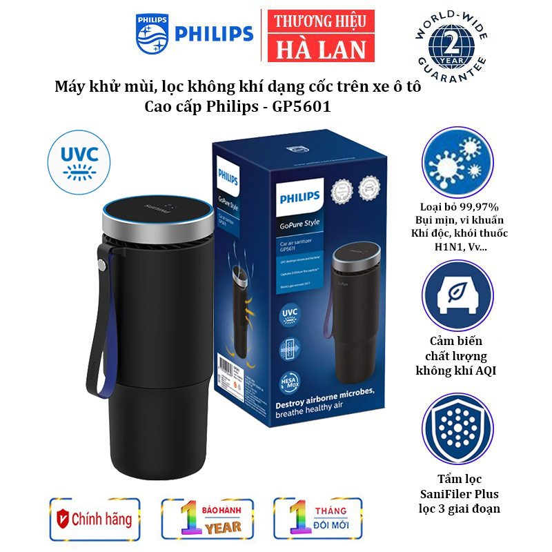 Philips là tên gọi phổ biến nhất của Koninklijke Philips Electronics N.V. (Royal Philips Electronics), là một công ty điện tử đa quốc gia Hà Lan và là một trong những công ty điện tử lớn nhất thế giới. Không chỉ sản xuất điện tử tiêu dùng, chiếu sáng, thiết bị y tế… Mà còn sản xuất các loại tẩu sạc và máy khử mùi, lọc không khí trên ô tô nổi tiếng. Đặc biệt là máy lọc không khí dạng cốc trên xe ô tô Philips GP5601Ưu điểm- Thiết kế đẹp, nhỏ gọn, sang trọng. Vỏ ngoài giống kim loại, có đèn hiển thị rực rỡ.Tích hợp 5 công nghệ tiên tiến để bảo vệ không khí trong xe- Phân hủy vi rút nhanh chóng và khử trùng- Bảo vệ khỏi tia cực tím- Lọc nano để loại bỏ vi rút và vi khuẩn- Bộ lọc HESAMax loại bỏ khí độc hại và mùi hôi- Kết nối USB ổn định và tiện lợiSử dụng hai bộ lọc HESAMax và SaniFiler Plus đời mới nhất của Philips- Bộ lọc HESAMax loại bỏ khí độc hại và mùi hôi, đặc biệt sau khi tắt máy bộ lọc vẫn hoạt động liên tục và tiếp tục loại bỏ khí độc hại trong vòng 24 giờ. Hấp thụ hiệu quả các khí độc hại và mùi hôi, khả năng hấp phụ gấp 30 lần than hoạt tính thông thường.- Tẩm lọc SaniFiler Plus lọc 3 giai đoạn mạnh mẽ độc đáo loại bỏ tới 125 chất gây ô nhiễm có hại và khí thải và các loại virut, thông qua các lớp HEPA và HESA. Được chứng nhận độc lập bởi Airmid Healthgroup, công nghệ SaniFilter Plus cũng loại bỏ tới 99% các hạt bụi siêu mịn và các chất gây dị ứng trong xe. Lọc hiệu quả các hạt nhỏ đến 0,004um, bao gồm các loại vi rút và vi khuẩn tức là nhỏ hơn 40 lần so với Virut SARS-Corona, nhỏ hơn 100 lần so với các loại virut thông thường . Công nghệ lá chắn UVC- Thiết kế độc đáo đảm bảo sử dụng an toàn, bạn không cần phải lo lắng về việc tiếp xúc với tia cực tím- Sử dụng công nghệ UVC LED của Philips, không có ozone, không giải phóng thủ_y ng_ân- Đèn led khử trùng bằng tia cực tím UVC, diệt khuẩn trong vòng 49 giây, loại bỏ tới 99.9% các loại Virus. Giá sản phẩm trên Tiki đã bao gồm thuế theo luật hiện hành. Bên cạnh đó, tuỳ vào loại sản phẩm, hình thức và địa chỉ giao hàng mà có thể phát sinh thêm chi phí khác như phí vận chuyển, phụ phí hàng cồng kềnh, thuế nhập khẩu (đối với đơn hàng giao từ nước ngoài có giá trị trên 1 triệu đồng).....