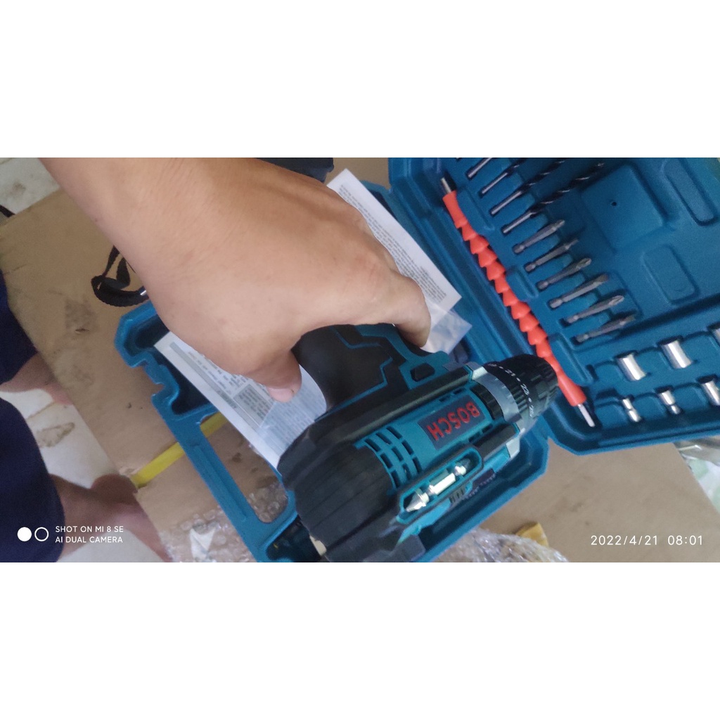 MÔ TẢ SẢN PHẨM BỘ MÁY KHOAN PIN BẮT VÍT 36V - ĐẦY ĐỦ ĐỒ NGHỀ ----------------------------------------------------------------------------------- 1: THÔNG SỐ KỸ THUẬT: Chất liệu vỏ máy: Nhựa ABS + Cao Su chống trượt - Điện thế pin: 36V - Loại Pin Lithium-ion Lực siết/mở vít : Cứng (42Nm); Mềm (24Nm) - Thời lượng pin : 2.5-3h liên tục 18 cấp độ trượt 3 chức năng : bắt vít, khoan, khoan búa - Đường kính đầu khoan : 10mm - Màu sắc: Xanh - Trọng lượng máy :1.2kg ( cả hộp 2.8kg) - Bảo hành: 12 tháng - Phụ kiện bao gồm: 1 hộp máy, 1 thân máy, 1 sạc pin, 2 pin 36V lion, 24 phụ kiện kèm theo 2: TÍNH NĂNG NỔI BẬT : Sự thuận tiện và dễ dàng thao tác là yếu tố đầu tiên mà khách hàng lựa chọn khi cần trang bị cho mình một chiếc máy khoan mini,máy khoan cầm tay Khả năng hoạt động mạnh mẽ, hiệu quả, độ chuẩn xác cao, thiết kế chuyên dụng, kích thước gọn nhẹ giúp bạn thao tác một cách nhanh chóng, thuận tiện và an toàn nhất. Đây là sản phẩm thích hợp cho các thợ sửa chữa chuyên nghiệp lẫn cho gia đình của bạn. Thiết kế hộp đựng thông minh giúp bạn mang theo đến bất kì đâu Pin máy khoan sử dụng pin Li-ion 36v 5ah chất lượng cao ( tuổi thọ cao gấp 4 lần, nhẹ hơn 40% pin bình thường) Thao tác tốt trên các chất liệu : Khoan tường, khoan sắt, kẽm, tôn, gỗ... Có đèn led định vị, giúp bạn dễ dàng làm việc kể cả trong bóng tối. 3: CHẾ ĐỘ BẢO HÀNH: - Bảo hành sản phẩm 12 tháng trên toàn quốc. - Đổi mới miễn phí trong 7 ngày đầu nếu có lỗi của nhà sản xuất. - Cam kết sản phẩm giống như hình ảnh. Chất lượng đúng như mô tả. cảm ơn đã ủng hộ shop