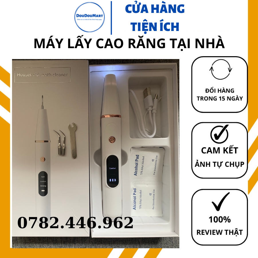 Sản phẩm: Máy lấy cao răng tại nhà 3 chế độ làm sạch cao răng tích hợp đèn led soi sáng THÔNG TIN SẢN PHẨM: Chất liệu: Nhựa ABS cao cấp Bộ sản phẩm gồm: 1 máy lấy cao răng + 3 đầu làm sạch + 1 cáp sạc + 1 cờ lê thay đổi đầu Điện áp: 5V công suất: 0,8W 3 chế độ với tầ