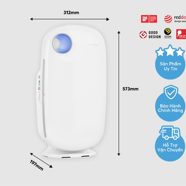 Mô Tả Sản Phẩm 1. Tên sản phẩm: MÁY LỌC KHÔNG KHÍ COWAY AIRES (10) AP-1009CH _Máy lọc không khí cho cuộc sống trong lành từng hơi thở_ 2. Mô tả ngắn gọn Thiết kế tinh tế sang trọng phù hợp cho phòng 33m2 Hệ thống lọc 3 lớp loại bỏ bụi, vi khuẩn, virus hiệu quả Chế độ tự động kết hợp cùng hệ thống điều chỉnh 4 cấp độ gió với 1 nút bấm Chế độ tắt đèn hiển thị vào ban đêm giúp dễ ngủ và tiết kiệm điện năng Vận hành êm ái, không gây tiếng ồn nhờ động cơ DC Tiết kiệm điện năng và chi phí cho gia đình Chế độ an toàn tự động tắt nguồn khi mở nắp máy Vệ sinh dễ dàng và hệ thống báo thay màng khi đến hạn tiện lợi Cảm biến chất lượng không khí bằng hiển thị LED thông minh 3. Tính năng nổi bật ★ Máy lọc không khí Coway Aires (10) AP-1009CH được cấu thành bởi các bộ phận chính như thân máy, quạt hút gió, hệ thống màng lọc, cửa thổi ra gió sạch dễ dàng vệ sinh. Vỏ máy được làm bằng nhựa cao cấp, bền bỉ, hạn chế được tình trạng trầy xước, không bị biến dạng khi va chạm mạnh. Các màng lọc có thể tháo rời một cách nhẹ nhàng.★ Máy được trang bị tính năng hiển thị mức độ ô nhiễm không khí qua 4 màu sắc đèn LED giúp người dùng dễ dàng nhận biết được chất lượng không khí của căn phòng và có thể chủ động điều chỉnh tốc độ hiệu quả.✓ Đèn màu xanh: Không khí sạch.✓ Đèn màu tím nhạt: Không khí ô nhiễm nhẹ.✓ Đèn màu tìm sẫm: Không khí ô nhiễm.✓ Đèn màu đỏ: Không khí ô nhiễm nặng. ★ Hệ thống thông minh điều chỉnh 4 cấp độ gió với 1 nút bấm.Máy lọc không khí Coway Aries (10) trang bị 4 cấp độ gió để đem lại hiệu quả lọc không khí tốt nhất.Với mức độ tiêu thụ điện năng thấp chỉ tương đương với một chiếc quạt thông thường, thiết bị tiết kiệm tối đa chi phí cho gia đình bạn. ★ Ở Chế độ Tự động (Auto), tốc độ quạt gió sẽ được điều chỉnh tự động theo mức độ ô nhiễm trong phòng nhờ vào cảm biến chất lượng không khí. ★ Máy lọc không khí Coway Aires (10) AP-1009CH có chế độ an toàn tự động tắt nguồn khi tháo dỡ và đèn báo thay màng lọc khi đế người sử dụng dễ dàng nhận biết để thay thế khi đến hạn. ★ 3 lớp màng lọc đem lại hiệu quả làm sạch không khí ở mức tốt nhất và loại bỏ những bụi mịn mà mắt thường không thể nhìn thấy.✓ Màng lọc thô ngăn các loại bụi có kích thước lớn như bụi vải, tóc và lông động vật.Thời gian thay thế: Không cần thay thếVệ sinh định kì: 2~4 tuần ✓ Màng lọc khử mùi Carbon với chức năng khử mùi được tăng cường nhờ carbon hoạt tính lọc hiệu quả các khí độc hại, mùi khó chịu như khí thải, khí ga, mùi nội thất, mùi thức ăn, mùi ẩm mốc.Thời gian thay thế: 24 tháng*Lưu ý: Trong trường hợp khách hàng mua Màng lọc thay thế sẽ không bao gồm viền khung nhựa ABS bên ngoài màng lọc ✓ Màng lọc HEPA - màng lọc quan trọng nhất của máy, có khả năng loại bỏ bụi mịn, khói thuốc lá, vi khuẩn và nấm mốc gây bệnh và các phân tử bụi nhỏ có kích thước mà mắt thường khó nhìn thấy trong suốt thời gian hoạt động.Thời gian thay thế: 12 tháng 4. Thông số kỹ thuật- Công suất lọc (CADR): 4,3m3 ~ 151,8 ft3/phút- Diện tích sử dụng: 33m2 ~ 355 ft2- Điện áp: 220 V, 60 Hz- Mức tiêu thụ điện: 38 W- Độ ồn tối đa: 49 dB- Tốc độ gió: Thấp - Trung bình - Cao - Turbo- Lọc bụi mịn PM 0.03: Có- Đèn báo chất lượng không khí: Có- Chế độ cảm biến bụi và cảnh báo thay màng lọc : Có- Kích thước (R x C x S): 335 x 686 x 203 mm ~ 13,2 x 27,0 x 8,0 inch- Trọng lượng tịnh: 5,9 kg ~ 13 lb 5. Phương thức bảo hànhKhách hàng đăng ký bảo hành bằng các cách sau:Cách 1: Khách hàng quét mã QR trên Thẻ bảo hành hoặc Tem bảo hành đi kèm sản phẩm và điền thông tin đăng ký bảo hành trên website Coway Vina.Cách 2: Khách hàng gọi đến tổng đài miễn phí 1800 556 892 và làm theo hướng dẫn. Giá sản phẩm trên Tiki đã bao gồm thuế theo luật hiện hành. Bên cạnh đó, tuỳ vào loại sản phẩm, hình thức và địa chỉ giao hàng mà có thể phát sinh thêm chi phí khác như phí vận chuyển, phụ phí hàng cồng kềnh, thuế nhập khẩu (đối với đơn hàng giao từ nước ngoài có giá trị trên 1 triệu đồng).....