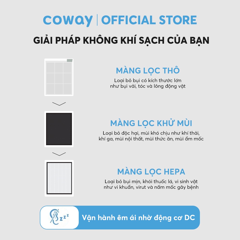 MÁY LỌC KHÔNG KHÍ COWAY CARTRIDGE AP-1019C (W) ✿ Máy lọc không khí có màng lọc nhấc rời đầu tiên và duy nhất ✿ ❤ Mô tả ngắn gọn - Máy lọc không khí thế hệ mới, cải tiến và tiện ích hơn cho ngưởi sử dụng - Thiết kế trang nhã và độc nhất – đạt nhiều giải thưởng quốc tế - Hệ thống lọc bụi mạnh mẽ với 3 bước lọc có khả năng làm sạch không gian với diện tích đến 33m2 - Cảm biến bụi giúp điều chỉnh tốc độ quạt gió và luồng khí lưu thông trong phòng một cách tự động - Đèn chỉ báo chất lượng không khí theo thời gian thực - Màn hình điều khiển thân thiện với người dùng: chỉ cần chạm nhẹ để chọn chế độ - Màng lọc thô có thể nhấc rời giúp vệ sinh và thay màng lọc dễ dàng - Cảnh báo vệ sinh và thay thế màng lọc hữu ích - Vận hành êm ái, không gây ra tiếng ồn nhờ động cơ DC ❤ Tính năng nổi bật ★ Chạm nhẹ để điều chỉnh dễ dàng - bao gồm tốc độ gió, nguồn điện, bật/tắt đèn, và cài đặt thời gian thay màng lọc. ★ Ở chế độ Tự động, cảm biến bụi sẽ liên tục theo dõi không khí trong phòng và hiển thị bằng 4 màu đèn LED khác nhau giúp bạn dễ dàng lựa chọn chế độ hoạt động phù hợp: ✓ Cảm biến bụi cũng phát hiện ô nhiễm không khí trong nhà theo thời gian thực và tự động điều chỉnh tốc độ quạt gió. ✓ Khi trạng thái không khí sạch được duy trì trong một khoảng thời gian nhất định ở chế độ Tự động, máy lọc sẽ tự động chuyển sang chế độ Yên lặng. Và khi mức độ ô nhiễm thay đổi, máy sẽ chuyển lại hoạt động ở chế độ Tự động. ★ Chế độ Yên tĩnh tạo ra một môi trường thoải mái hơn khi hạn chế tối đa âm thanh bằng cách giảm tiếng ồn và công suất hoạt động của máy. Bạn cũng có thể tắt đèn chỉ báo chất lượng không khí để ngủ dễ dàng hơn. ★ Thay thế màng lọc dễ dàng bằng cách nhấc rời màng lọc thô và mang đến vị trí mong muốn trước khi thay thế các màng lọc còn lại. ✓ Dễ dàng tháo nắp máy phía trước với một động tác và mang đến vị trí mong muốn ✓ Nhẹ nhàng tháo các màng lọc cũ và lắp màng lọc mới ✓ Lắp ráp sản phẩm và cài lại màng lọc ★ Màng lọc thô dễ dàng tháo rời và vệ sinh: Nhấc rời màng lọc thô khỏi máy để thao tác thuận tiện ➨ Vệ sinh định kỳ từ 2 đến 4 tuần ➨ Dễ dàng làm khô màng lọc thô bằng cách treo lên phía trước nắp máy lọc ★ Đèn báo hiệu thay thế màng lọc cho bạn biết thời điểm cần đổi sang màng lọc HEPA/khử mùi mới, không cần phải tự ghi nhớ. ★ 3 lớp màng lọc đem lại hiệu quả làm sạch không khí ở mức tốt nhất và loại bỏ những bụi mịn mà mắt thường không thể nhìn thấy ✓ Màng lọc thô ngăn các loại bụi có kích thước lớn như bụi vải, tóc và lông động vật. Thời gian thay thế: Không cần thay thế Vệ sinh định kì: 2~4 tuần ✓ Màng lọc khử mùi Carbon với chức năng khử mùi được tăng cường nhờ carbon hoạt tính lọc hiệu quả các khí độc hại, mùi khó chịu như khí thải, khí ga, mùi nội thất, mùi thức ăn, mùi ẩm mốc. Thời gian thay thế: 24 tháng ✓ Màng lọc HEPA - màng lọc quan trọng nhất của máy, có khả năng loại bỏ bụi mịn, khói thuốc lá, vi khuẩn và nấm mốc gây bệnh và các phân tử bụi nhỏ có kích thước mà mắt thường khó nhìn thấy trong suốt thời gian hoạt động. Thời gian thay thế: 12 tháng ❤ Thông số kỹ thuật - Diện tích sử dụng: 33 m2 ~ 355 ft2 - Điện áp: 220 V, 60 Hz - Mức tiêu thụ điện: 35 W - Độ ồn tối đa: 47,8 dB - Tốc độ gió: Yên tĩnh - 1 - 2 - Lọc bụi mịn PM 0.01: Có - Đèn báo chất lượng không khí: Có - Chế độ cảm biến bụi và cảnh báo thay màng lọc : Có - Kích thước (R x C x S): 340 x 469 x 165 mm ~ 13,4 x 18,5 x 6,5 inch - Trọng lượng tịnh: 5,5 kg ~ 12,1 lb ❤ Phương thức bảo hành Khách hàng đăng ký bảo hành bằng các cách sau: ➨Cách 1: Khách hàng quét mã QR trên Thẻ bảo hành hoặc Tem bảo hành đi kèm sản phẩm và điền thông tin đăng ký bảo hành trên website Coway Vina. ➨Cách 2: Khách hàng gọi đến tổng đài miễn phí CowayVina và làm theo hướng dẫn. Lưu ý: Để đảm bảo quyền lợi của khách hàng, Công ty TNHH Coway Vina chỉ nhận đăng ký bảo hành trong vòng 05 ngày sau khi mua hàng. ❤ Khu vực miễn phí giao hàng và lắp đặt ➨ Miền Bắc: Hà Nội, Bắc Ninh, Bắc Giang, Hưng Yên, Vĩnh Phúc, Hải Dương, Hà Nam, Nam Định, Thái Bình, Ninh Bình, Thái Nguyên, Hải Phòng, Quảng Ninh, Hoà Bình, Phú Thọ, Thanh Hóa, Tuyên Quang (Chiêm Hóa, Hàm Yên, Thành phố Tuyên Quang, Yên Sơn, Sơn Dương), Yên Bái (Văn Chấn, Trấn Yên, Yên Bình, Thành phố Yên Bái, Văn Yên), Bắc Kạn (Chợ Mới, Bạch Thông, Na Rì, Thành phố Bắc Cạn, Chợ Đồn), Lạng Sơn ➨ Miền Trung: Các khu vực lân cận Đà Nẵng: Đà Nẵng, Quảng Nam (Hội An, Điện Bàn, Đại Lộc) ➨ Miền Nam: Hồ Chí Minh, Đồng Nai, Bình Dương, Bà Rịa - Vũng Tàu, Long An, Tiền Giang, Cần Thơ, Vĩnh Long, Bến Tre, Tây Ninh, Đồng Tháp, Bình Phước, Trà Vinh, Bình Thuận (Hàm Tân, Bình Thuận Nam, T