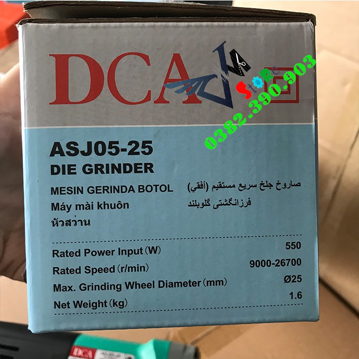 Máy mài khuôn DCA ASJ05-25 - máy mài khuôn DCA Thông số kỹ thuật - Mã sản phẩm: ASJ05-25 - Nhà sản xuất: DCA - Xuất xứ: Đài Loan - Công xuất: 550W - Điện áp: 220V-50Hz - Tốc độ: 9000-26700 vòng/phút - Cốt mũi mài: 6mm - Khả năng mài từ 6-25mm - Trọng lượng: 1.6kg -
