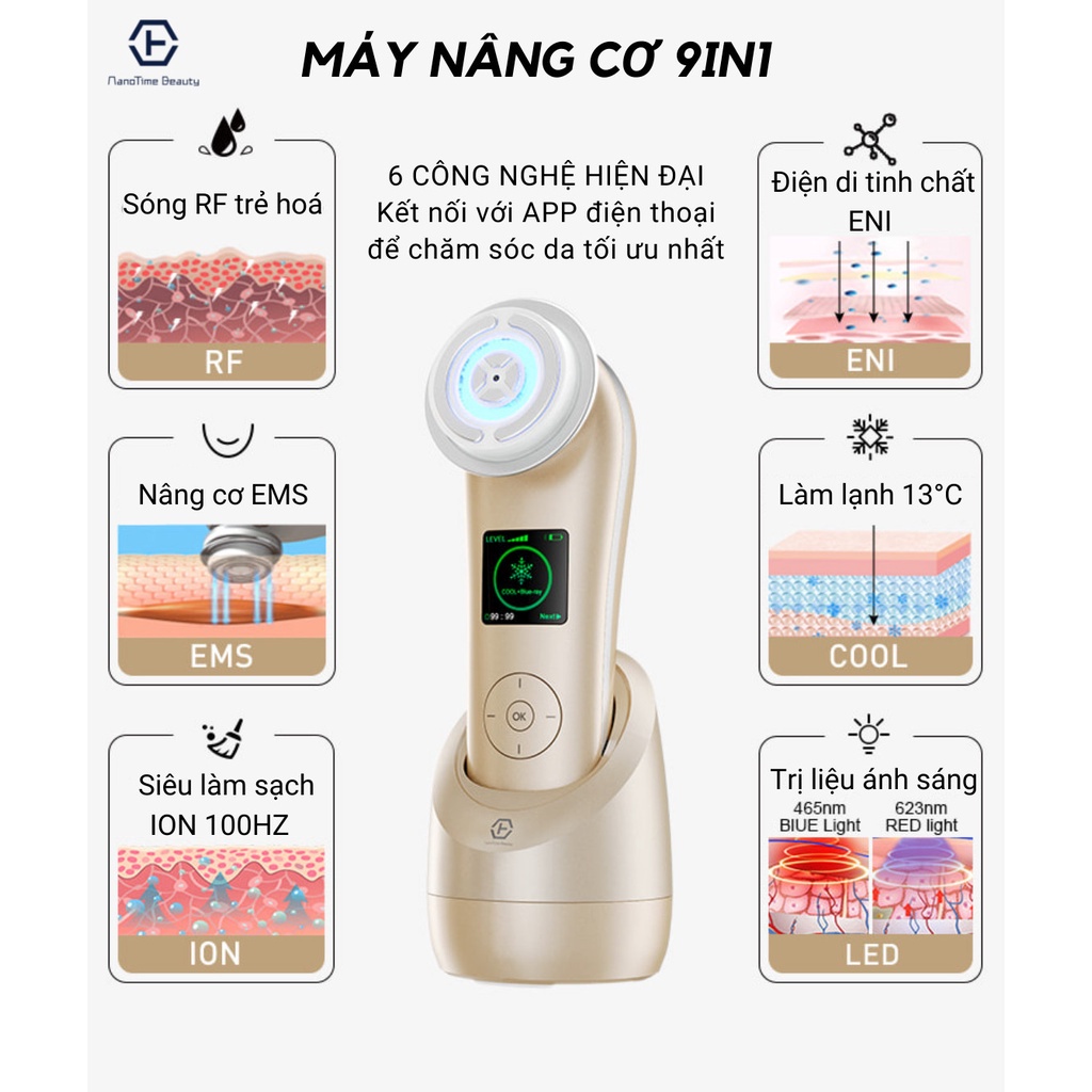 Máy nâng cơ mặt đẩy tinh chất trẻ hóa da Nanotime F81E HT Beauty, máy massage chăm sóc da bằng sóng RF Photon kết nốiapp