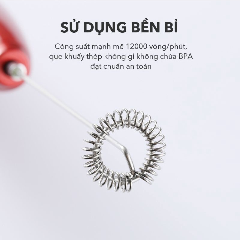 Máy tạo bọt sữa Samono Với các tín đồ mê cafe, capuchino thay vì tốn tiền ra tiệm mua hàng ngày thì nay ta đã có thể sở hữu một quán cafe ngay tại nhà với mức giá siêu rẻ!!! ĐẶC ĐIỂM SẢN PHẨM + Tạo bọt sữa thơm ngon ngay lập tức (20 giây) để thưởng thức cafe với lớp kem sữa béo ngậy. + Tính nhất quán hoàn hảo nhờ que đánh bọt bằng thép không gỉ, tốc độ tối đa 12000 vòng/phút. + Que khuấy thép không gỉ không chưa BPA đạt chuẩn an toàn + Hoạt động đơn giản chỉ bằng một công tắc, độ ồn thấp + Tiện dụng và nhỏ gọn, dễ dàng cất giữ. THÔNG SỐ KỸ THUẬT + Thương hiệu: SAMONO + Chạy bằng pin AA + Dễ dàng làm sạch bằng nước ấm. + Kích thước: 4,5 x 4,5 x 23,3 cm + Màu sắc: Bạc, Đỏ, Đen