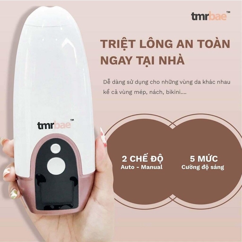 Hoạt động trên bất kỳ bộ phận nào của cơ thể bao gồm cả mặt và bikini. Công nghệ IPL đã được chứng minh tẩy lông tại nhà an toàn và hiệu quả. Kết quả lâu dài với chi phí chỉ bằng một phần nhỏ khi tẩy lông tại spa. Loại bỏ lông một cách dễ dàng, không có vết dao cạo và không có lông mọc ngược? Thiết bị cầm tay tmrbae™ IPL có thể được sử dụng trên bất kỳ bộ phận nào của cơ thể với 2 chế độ. MANUAL MODE: Cho các vùng như nách, bikini và môi. Nhấp vào nút cho mỗi lần sử dụng và lặp lại. AUTO MODE: Sử dụng nhanh chóng cho các khu vực rộng như chân và tay. Không cần nhấn nút, đèn sẽ tự động nhấp nháy. Thiết bị tẩy lông bằng Laser tmrbae™ IPL là giải pháp hoàn hảo cho những ai muốn thử triệt lông bằng laser tại nhà. Sử dụng công nghệ ánh sáng xung cường độ cao vượt trội để phá hủy các nang lông không mong muốn và mang lại kết quả nhanh chóng và lâu dài. Lý tưởng cho việc triệt lông vĩnh viễn, lâu dài, thiết bị triệt lông bằng laser này có thể thực hiện điều trị toàn thân trong vòng 30 phút - và không gây đau đớn!