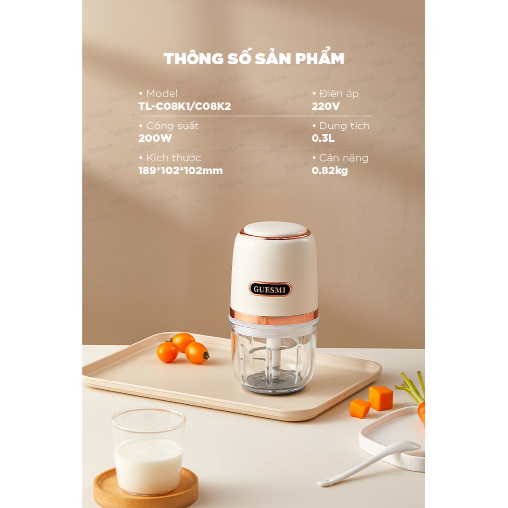 Máy Xay Thịt Mini Đa Năng 2 Cối 0.3L TULI GUESMI TL-C08K1, 200W, Xay Cháo Sinh Tố Tỏi Ớt Cá Tôm Rau Củ Quả, BH 18 tháng