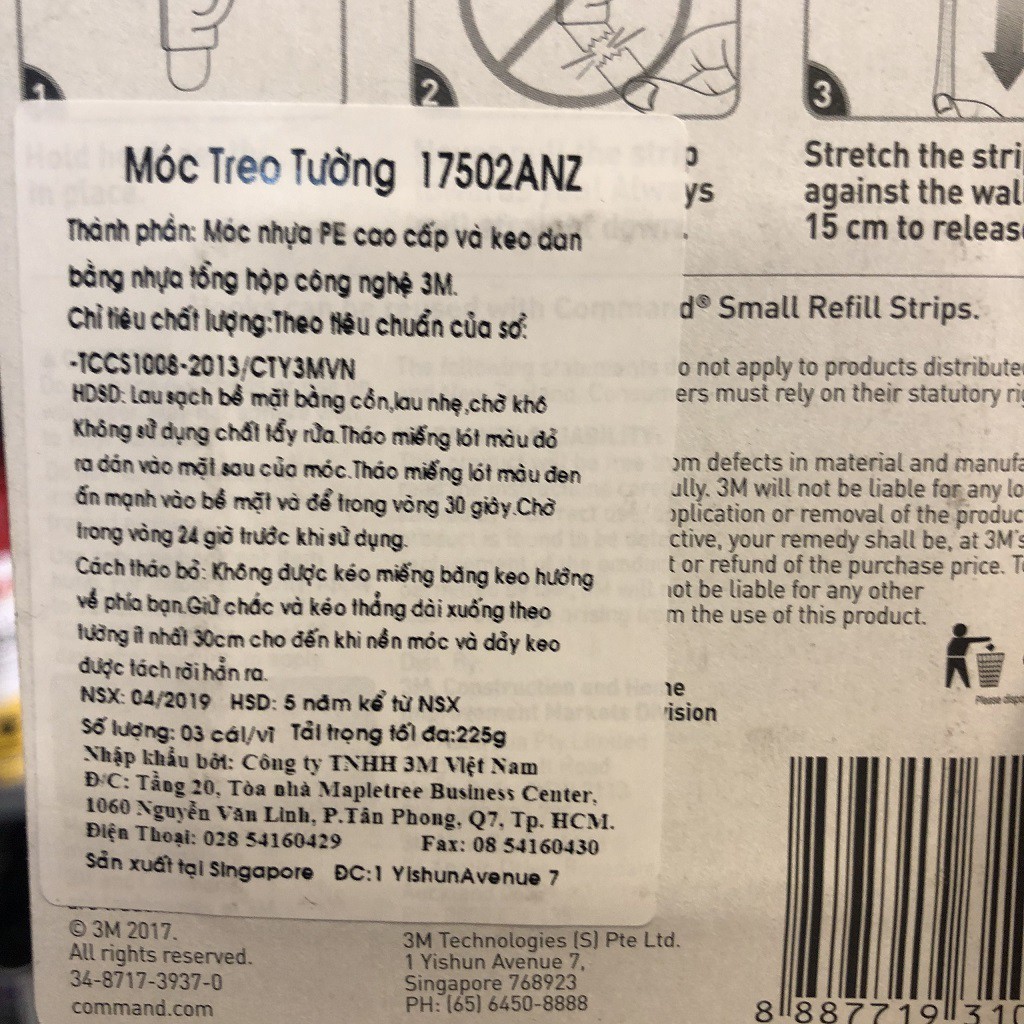 ✨✨Thông số kỹ thuật • Khối lượng tối đa chịu được: 225g • Màu sắc: Trắng • Chất liệu: Nhựa PE cao cấp và keo dán bằng nhựa tổng hợp công nghệ 3M • Xuất xứ: Singapore ✨✨Hướng dẫn sử dụng: - Lau sạch bề mặt bằng cồn, lau nhẹ, chờ khô - Không sử dụng chất tẩy rửa. Tháo miếng lót màu đỏ ra dán vào mặt sau của móc. - Thóa miếng lót màu đen ấn mạnh vào bề mặt và để trong vòng 30 giây. Chờ trong vòng 24 giờ trước khi sử dụng. ✨✨Cách tháo keo dán: Không được kéo miếng băng keo hướng về phí bạn. Giữ chắc và kéo thẳng dài xuống theo tường ít nhất 30cm cho đến khi nền móc và dảy keo được tách rời hẳn ra. ✨✨Mô tả sản phẩm: Combo 2 Vỉ Móc dán tường vuông 225gr vỉ 3 cái Command 3M 17502 có thể sử dụng ở bất kì vị trí nào trong nhà thích hợp để treo quần áo, móc khóa,... cho nhà cửa luôn gọn gàng, ngăn nắp. • Khối lượng tối đa chịu được: 225g • Sử dụng đơn giản, dễ dàng, không cần đóng đinh, khoan vít… • Không làm hư hỏng bề mặt tường, không để lại vết keo sau khi không sử dụng • Keo bám cực chắc chắn • Dùng được trên nhiều bề mặt tường từ tường sơn, gạch men, gỗ, kính… • Dễ dàng thay thế, tháo gỡ khi không sử dụng • Chất liệu an toàn, độ bền cao • Thương hiệu: Command 3M ✨✨Giới thiệu thương hiệu Command - Móc Dán Tường Kiểu Mỹ - Giải pháp an toàn cho tường nhà bạn - Bám Cực Chắc! Tháo Cực Dễ! Được thành lập từ năm 1902 tại Mỹ và nhanh chóng được ưa chuộng tại 72 quốc gia toàn cầu, Command tự hào luôn dẫn đầu với các sản phẩm đột phá về giải pháp dán tường. Với công nghệ kéo dãn độc quyền, Command nổi tiếng với tiêu chí: "Không khoan đục - không vỡ tường", chỉ với vài thao tác nhỏ với miếng dán bám cực chắc chắn, bạn không cần chuẩn bị lỉnh kỉnh dụng cụ khoan đục hay lo lắng về vết nứt vỡ xấu xí trên bề mặt tường nữa. Kounbox cam kết bán tất cả các sản phẩm Command 3M chính hãng – uy tín – chất lượng!!! #Command3M #ThuongHieuMy #DoDungPhongTam #MocTreoTuong #Mocdantuongvuong #DoGiaDung #Mocdan #Mocdantuong #Moctreokhan #Kounbox #Mocchiakhoa