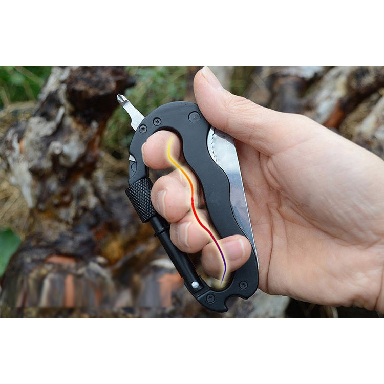 Móc khoá đa chức năng là vật dụng đa năng khi đi phượt ngoài chức năng treo chìa khóa, sản phẩm còn tích hợp lưỡi dao nhỏ khá bén để cắt dây, gọt đồ… và 2 đầu tô vít nhỏ dùng mở ốc 4 cạnh và 2 cạnh. Chốt xoáy cố định móc không bị tuột. 5 chức năng chính : - Tua vít