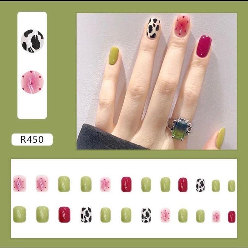 Móng tay giả set 24 Móng ( Tặng kèm 1 lọ keo dán) +Chất liệu: Nhựa mỏng +Size: mini +Màu sắc: Nhiều màu -Bộ gồm 24 móng thiết kế phù hợp với mọi kích thước tay Tính chất thẩm mỹ: tạo hiệu ứng cho móng ----------------------------------------------------------------