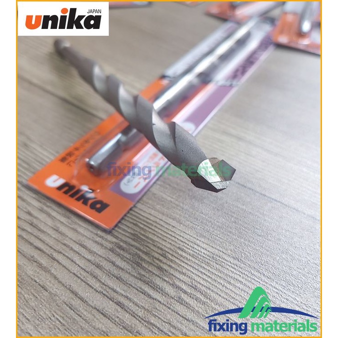Mũi khoan chuôi lục giác UNIKA, Mã RJ - Công dụng: + Khoan tường gạch. + Tốt: vữa xi măng-plastic, bê tông nhẹ, nhựa PVC, đá phiến.. - Đặc trưng: Đầu mũi khoan được làm bằng thép hợp kim TCT với thiết kế dao cắt cạnh không đối xứng để giảm lực kháng cắt, giúp cho việ
