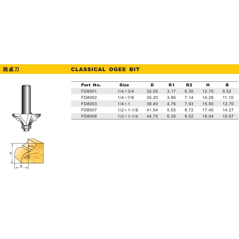 Mũi phay gỗ hình sen ngược Fangda (Tên gọi thông dụng : mũi phay gỗ, dao phay gỗ, mũi router, mũi soi gỗ) Mũi phay thương hiệu Fangda là dòng mũi ở phân khúc phổ thông được nhiều khách hàng lựa chọn sử dụng hiện nay nhờ vào chất lượng khá ổn so với giá thành của nó. + Tất cả các lưỡi dao được xử lý nhiệt, có độ bền cao, mạnh mẽ hiệu suất tốt, đường cắt sắc nét, bi loại tốt giúp mũi quay nhẹ nhàng và trơn tru + Đường kính trục (cốt ): Cốt nhỏ 1/4" ~6.35mm - Cốt lớn 1/2"~12.7mm + Các thông số cơ bản: - D= Đường kính lưỡi dao - R1: Bán kính cong lõm - R2: Bán kính cong lồi - H= Độ cao (hoặc dài) của lưỡi dao - B= Độ dày tính từ mép gỗ vào, phần mà mũi có thể ăn vào gỗ (= khoảng cách từ mép vòng bi tới mép mũi phay + Các kích thước mũi: Mũi cốt lớn 1/2" và cốt nhỏ 1/4" có các thông số D, R1, R2, , H, B như nhau Mũi D(mm) R1(mm) R2(mm) H(mm) B(mm) 1/4x1/2" 25.71 1.60 4.76 9.51 6.35 1/4x5/8" 28.9 2.38 5.56 11.1 7.94 1/4x3/4" 32.05 3.17 6.35 12.7 9.52 1/4x7/8" 35.2 3.96 7.14 14.28 11.1 1/4x1" 38.4 4.76 9.93 15.9 12.7 + Công dụng : Điêu khắc họa tiết, cắt cạnh, tạo viền hoa văn đẹp mắt cho sản phẩm đồ gỗ nội thất, khi phay nên chú ý tốc độ điều khiển để tránh làm cháy gỗ - Mũi phay được làm bằng chất liệu thép cứng cáp, có độ bền cao, cho tốc độ khoan nhanh hơn, giúp tạo nên những đường rãnh đồng đều trên nhiều bề mặt chất liệu khác nhau. Thiết kế những đường cắt vát được mài sắc giúp cho việc phay, tiện gỗ trở nên vô cùng dễ dàng. - Mũi phay sắc bén cho đường phay đẹp và mịn, không bị loang hay sần sùi tạo tính thẩm mỹ cũng như giúp đẩy nhanh quá trình lắp ráp công cụ, dụng cụ của bạn. - Sản phẩm có kích thước nhỏ gọn, dễ thao tác lắp vào đầu máy chính. Tuy lực tác dụng khi hoạt động là rất lớn nhưng bề mặt mũi phay lại không quá sắc nhọn, không gây sát thương khi lắp ráp, đảm bảo an toàn cho người sử dụng.. - Nhà sản xuất: Fangda Holding Co.,Ltd - Xuất xứ: Trung Quốc Nhà nhập khẩu: Công ty TNHH TM Yong Sheng Địa chỉ: 20 Duy Tân, Phường 15, Quận Phú Nhuận, Thành phố Hồ Chí Minh #mũirouter#muiphaygo#mũiphaygỗ #mũiphaygỗđầubi#mũiphaygỗ
