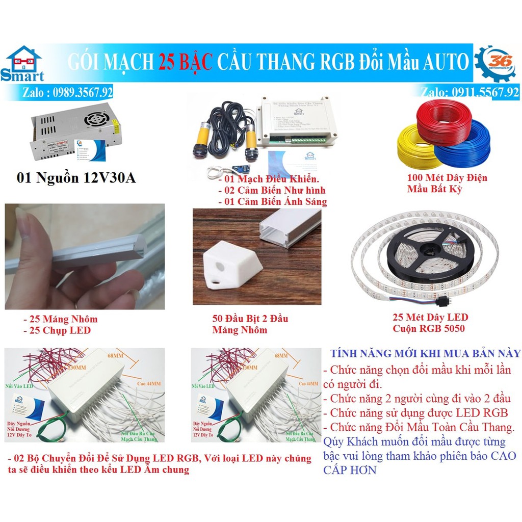– Điều khiển thiết bị điện cầu thang – Trang trí ngôi nhà bạn trở nên hiện đại hơn, sang trọng và tự động bật tắt – Chức năng tắt khi không có di chuyên trên cầu thang - Điện Áp: 12VDC – Ngõ ra Full 30 bậc do cải tiến lại nên chỉ dùng 27 Bậc, và 3 cổng còn lại không dùng. vì mục đích là sử dụng cho LED RGB, với LED RGB chúng ta phải thêm moduel mở rộng và kết hợp với 3 cổng trên, còn đối với led thanh đơn mầu thì chỉ dùng MAX nhất là 27 Bậc – Dòng lựa chọn nguồn thì quý khách lựa chọn loại nguồn tổ ong có dòng lớn tương đương với số bậc cầu thang cài đặt+ Ví Dụ: Cầu thang là 25 bậc thì chọn loại nguồn tổ ong 12v 25A hoặc cao hơn là loại nguồn có dòng 30A Đây là phiên bản mà chúng tôi đã nâng cấp thêm 1 số tính năng như sau: Bổ sung chức năng khi có 2 người cùng đi vào cầu thang LED sẽ sáng từ 2 bên ngoài vào Bổ sung chức năng có 1 người đi vào và đã đi hết cầu thang qua cảm biến 2 khi đó led nó đang tắt dần từ dưới lên rồi nhưng lại có một người nữa cũng đi từ dưới lên thì nó sẽ sáng nối tiếp vào và hiểu có người đang đi từ dưới lên trên. 1, Sản phẩm đã bao gồm: + 02 cảm biến khoảng cách loại 80cm + 01 Hộp nhựa PCL 145x90x40MM + Mạch điều khiển lắp bên trong mạch + Module cảm biến ánh sáng 2.Combo 25 bậc led dán 01 Hộp Nhựa PLC 145x90x40MM Chứa mạch điện tử 01 Module điều khiển LED cầu thang trung tâm 01 Nguồn Tổ Ong 12V 40A ( Loại ZIN). 01 Cảm biến ánh sáng. 02 Cảm biến khoảng cách như hình 100 Mét dây điện loại 5 cuộn led trắng ấm, cuôn 5m 3. Combo 25 bậc led thanh 01 Hộp Nhựa PLC 145x90x40MM Chứa mạch điện tử 01 Module điều khiển LED cầu thang trung tâm 01 Nguồn Tổ Ong 12V 40A ( Loại ZIN). 01 Cảm biến ánh sáng. 02 Cảm biến khoảng cách như hình 100 Mét dây điện loại 25 Máng nhôm dài 1m như hình 25 Chụp máng nhôm dài 1m như hình 50 Đầu bịt 2 đầu cho máng nhôm 25 Thanh LED Trắng Ấm. 4. Combo 25 bậc led RGB 01 Hộp Nhựa PLC 145x90x40MM Chứa mạch điện tử 01 Module điều khiển LED cầu thang trung tâm 01 Nguồn Tổ Ong 12V40A ( Loại ZIN). 01 Cảm biến ánh sáng. 02 Cảm biến khoảng cách như hình.( 100 Mét dây điện loại 25 Máng nhôm dài 1m như hình 25 Chụp máng nhôm dài 1m như hình 50 Đầu bịt 2 đầu cho máng nhôm 25 Mét dây LED RGB cuộn loại 5050. #ledcauthang #ledcauthangdep #machcauthangmoi #machledcauthang #machcauthangtotnhat #dieukhienledcauthng #thongminh #hiendai #dieukhiencauthang