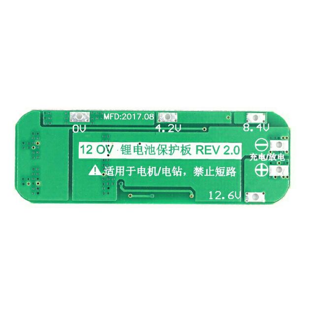 Mạch sạc và bảo vệ pin nối tiếp 3 cell Lithium (18650,26650,...) 12.6V. Dòng xả tối đa 20A Mạch có chức năng ngắt khi đầy, bảo vệ chống xả cạn. Sử dụng cho máy khoan, máy mài và các thiết bị sử dụng nguồn 9-12V. Thông số kỹ thuật: - Điện áp sạc 12.6-13V (nên dùng dòng từ 1-1.5A) - Điện áp sạc đầy: 12.6V - Điện áp ngắt xả 9.6V - Dòng xả tối đa 20A (nên sử dụng ở mức =< 15A để mạch bền hơn) - Có chức năng sạc cân bằng và bảo vệ cell pin - Kích thước: 58*30*2.6mm * Lưu ý: - Các cell trước khi gắn vào mạch phải cùng mức điện áp, tránh để điện áp thấp quá mạch sẽ không nhận pin và có thể gây hại cho mạch (nên ở mức 3.7V và cùng dung lượng). Nếu ghép nhiều cell 2p,3p,4p thì ngoài yêu cầu trên nên dùng cell cùng nội trở để khai thác tối đa công dụng của các cell pin - Khi ghép Ghép cell pin lần lượt theo thứ tự từ chân 0V- -> 4.2V -> 8.4V -> 12.6V trên mạch. Trường hợp chẳng may ghép không đúng quý vị hãy tháo ra và làm lại từ đầu. - Khi đã ghép xong các cell pin và mạch mà đo không thấy điện áp ở 2 chân P+ và P- thì quý vị hãy sạc mỗi (ghim sạc 5-10s) rồi kiểm tra lại. - Chân P+ và P- vừa là ngõ sạc vừa là ngõ ra. - Khi sạc sạc thì không xả và ngược lại.
