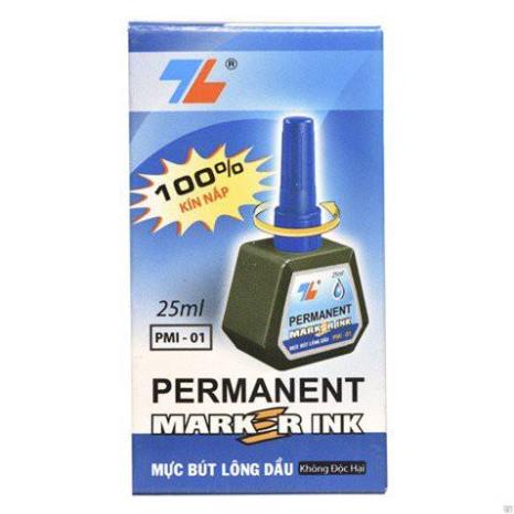 Thông số kĩ thuật : Tên danh mục Mực bút lông dầu Thương hiệu Thiên Long Dung tích mực 25 ml Loại mực mực dung môi cồn Đóng gói 1 lọ/ hộp, 6 hộp/ lốc Trọng lượng 42 gram Màu mực Xanh/Đỏ/Đen Mô tả: - Mực