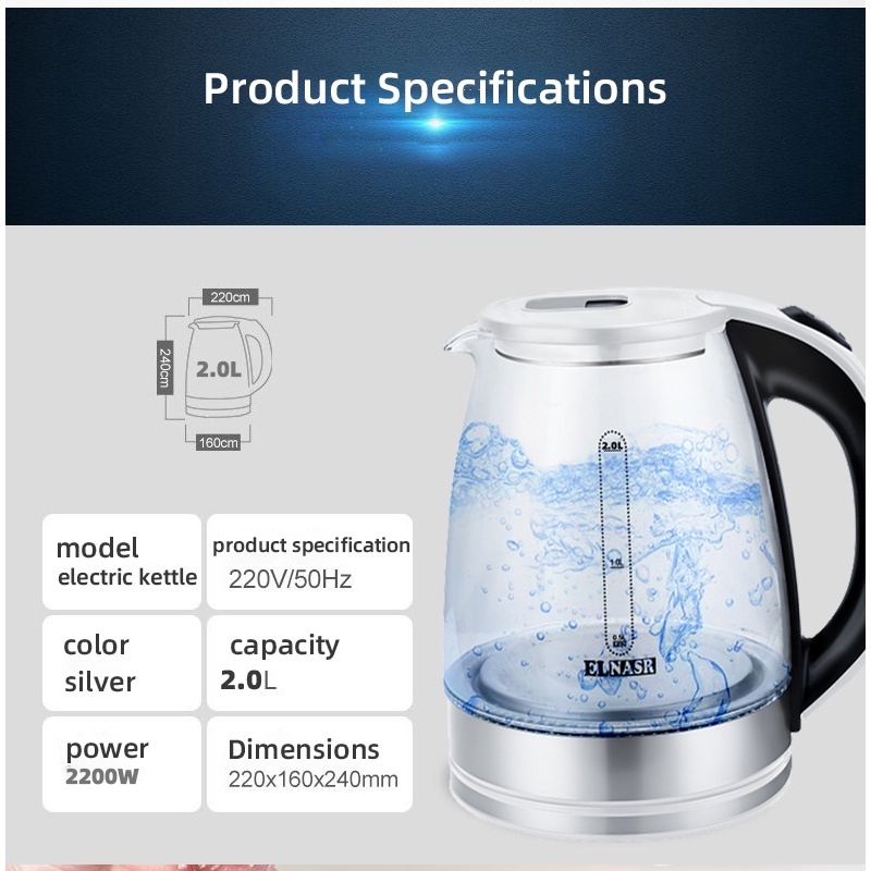 MAIMEITE Ấm siêu tốc 2L bằng thủy tinh trong suốt công suất 2200W Electric Kettle bảo hành 12 tháng - Hàng chính hãng
