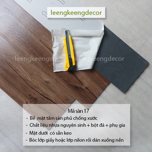 Miếng dán nền nhà giả gỗ sẵn keo vân chống trơn trượt hàng loại 1 mã số 17 màu óc chó * Sàn nhựa dán vân gỗ hay còn gọi là sàn nhựa bóc dán thông mình là vật liệu sàn đang hót hít trên thị trường. * Được làm từ nhựa PVC kết hợp với bột đá và phụ gia, keo kết dín