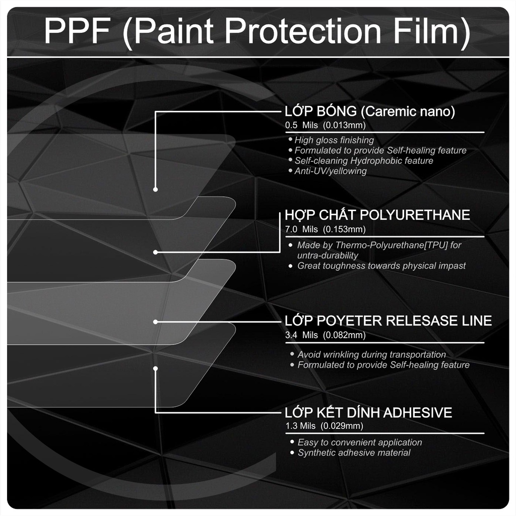 Thông tin sản phẩm theo Nghị định 85 Xuất xứ: Việt Nam Đơn vị sản xuất: Hoa Tay Việt - Đồng Nai Honda PCX 2018 Với nhiều bạn đã từng đi dán điện thoại thì các bạn sẽ rất ngại khi phải tự mình dán miếng dán mặt đồng hồ xe, hiểu được điều đó shop xin tư vấn cách dán của dòng PPF mặt đồng hồ này cho các bạn tham khảo. với cách dán truyền thống là dán khô. tức không dùng dung dịch để dán thì người dán cần phải có chút khéo tay nhưng trong trường hợp này ta có thể tự dán tại nhà một cách dễ dàng với cơ chế dán nước. (tham khảo hướng dẫn sử dụng.) Về cơ bản dán nước chính là xịt dung dịch vào bề mặt keo để khi tiến hành dán ta có thể căn chỉnh miếng dán dể dàng khi đã đặt lên mặt đồng hồ xe đồng thời miết hết bọt khí ra ngoài nhờ độ trơn của dung dịch. sau khi hoàn thành ta đợi dung dịch khô và keo trên PPF lại dính vào bề mặt đồng hồ như bình thường. Miếng dán PPF xuất phát từ công nghệ bảo vệ sơn ô-tô cao cấp Film PPF là thuật ngữ viết tắt của Paint Protection Film (PPF) là vật liệu Film bảo vệ màn hình, chất liệu chính của film này là Urethane nhiệt dẻo, ưu điểm của chất liệu này là rất bền, khả năng chống chịu tốt và có thể tự phục hồi với những “tổn thương” nhỏ. 💗💗💗💗💗💗💗💗💗💗💗💗💗💗💗 Cấu tạo của lớp PPF trong suốt gồm 6 lớp: Lớp tự phục hồi (self-healing) Chất tăng độ bóng (gloss enhancer) Lớp phủ chống nước (Hydrophobic top coat) Lớp nhựa chịu nhiệt dẻo (TPU) Chất kết dính (Adhesive) Lớp màng bảo vệ (release liner) Với ưu điểm: Bảo vệ tối ưu cho Mặt đồng hồ xe của bạn, ngăn mọi hiện tượng trầy xước màn hình do quá trình sử dụng. làm tăng tuổi thọ đồng hồ, chống tác hại của cọ xát làm mất thẩm mĩ của xe. Với độ trong suốt lên tới 99.9% đảm bảo góc nhìn dể dàng cho chủ xe. Khả năng tự hồi phục là 1 ưu điểm vượt trội của PPF khi mà những vết xước dăm đều dc làm mới bằng nhiệt độ từ ánh nắng mặt trời, thậm chí ta có thể dùng máy xấy hơ nóng để PPF tự hồi phục khi ở trong nhà. BỘ SẢN PHẨM GỒM 1. PPF 2. Khăn lụa 20*20 3. Chai dung dịch xà phòng 5ml 4. Miếng gạc nước 5. Hướng dẫn sử dụng. Hướng dẫn sử dụng: 1. Để xe nơi lặng gió, ít bụi tốt nhất là trong nhà và tắt hết quạt. 2. Lau sạch mặt đồng hồ bằng khăn vải, đặc biệt là các mép. 3. PPF gồm 3 lớp chính, ta lột lớp phủ màu trắng đục 4. Dùng chai dung dịch xịt lên bề mặt keo của PPF (mục đích là làm ướt bề mặt keo tránh để mặt keo bám bụi môi trường.) 5. Xịt dung dịch lên bề mặt đồng hồ xe và tiết hành dán 6. Lột miếng phủ còn lại của PPF 7. Dùng tay căn chỉnh miếng PPF khớp với mặt đồng hồ 8. Sau khi khớp ta dùng miếng gạc bắt đầu miết bọt khí từ trong ra ngoài đến khi nào hết bọt khí bên trong. 9. Hoàn thành dán. ta lau qua nhẹ nhàng. Ghi chú: Tới đây cơ bản là hoàn thành công đoạn dán nhưng cần phải chờ thêm 1 vài ngày để hơi nước trong PPF thoát ra hết để PPF đạt được độ trong hoàn hảo.