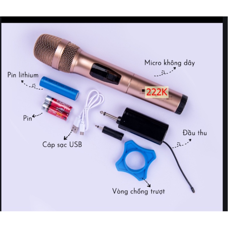 Phụ kiện: 1 hộp đựng, 1 micro, 1 đầu thu có jack nối 6.5 ( kết nối qua cổng USB và cổng micro ) Khoảng cách sử dụng: ~20m nhom nguyen khoi co pin sac lai nhiều lần 2000mah hát ko lo hết pin Nguồn điện micro: Pin AA (1.5V) X2 ban co thể mua bộ sạc 1 p