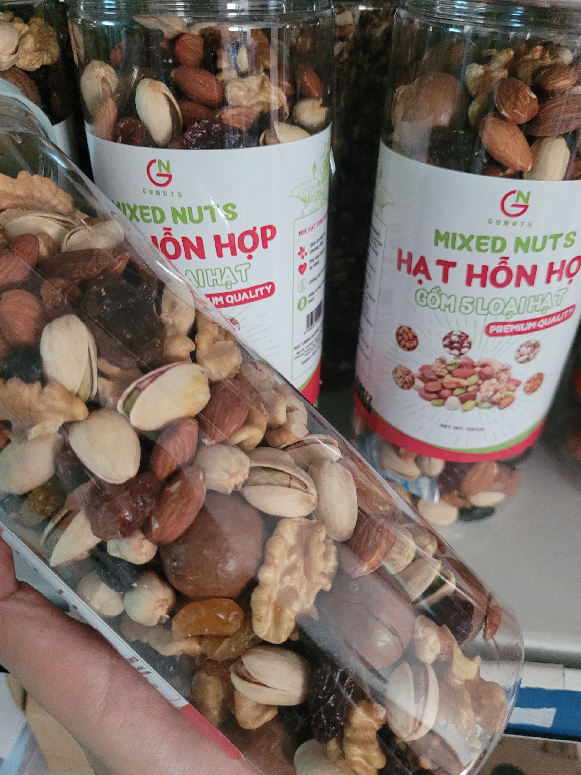 Hạt Mix Hỗn Hợp Gunuts Bao Gồm 5 Loại Hạt Granola Siêu Hạt Đã Sấy Chín Ăn Liền Hộp 500gr THÔNG TIN SẢN PHẨM - Thương hiệu: Gunuts - Khối lượng: 500g - Quy cách: Hộp 500g - Hạn sử dụng: 12 tháng kể từ ngày sản xuất - Ngày sản xuất: In trên bao bì sản phẩm ĐỐI TƯỢNG KHUYÊN DÙNG - Phù hợp với mọi đối tượng sử dụng CÔNG DỤNG - Trong hạnh nhân có chứa chất acid- folic, một loại chất giúp bà mẹ bổ sung dinh dưỡng cho thai nhi - Hạt óc chó bổ sung vitamin B1, B2, A,E, Protein, và khoáng chất cho cơ thể như canxi, phốt pho, mangan, sắt, đồng,…. - Hạt macca hỗ trợ tiêu hóa, ngăn ngừa viêm khớp dạng thấp, bệnh gút, sỏi thận và bệnh tim. - Nho khô hỗ trợ tiêu hóa, giảm cân khi ăn điều độ - Hạt bí giàu chất béo Omega-3, tốt cho phụ nữ ở tuổi mãn kinh - Hạt Dẻ Cười Hạt dẻ giúp cải thiện sức khỏe tim mạch, tốt cho sức khỏe của ruột. Bà bầu ăn hạt dẻ cười sẽ giúp đỡ bị nghén, là một món ăn vặt không tăng cân. Người ăn chay cũng nên ăn hạt dẻ cười mỗi ngày để bổ sung protein, nâng cao sức khỏe và bảo vệ thị giác.Giá sản phẩm trên Tiki đã bao gồm thuế theo luật hiện hành. Bên cạnh đó, tuỳ vào loại sản phẩm, hình thức và địa chỉ giao hàng mà có thể phát sinh thêm chi phí khác như phí vận chuyển, phụ phí hàng cồng kềnh, thuế nhập khẩu (đối với đơn hàng giao từ nước ngoài có giá trị trên 1 triệu đồng).....