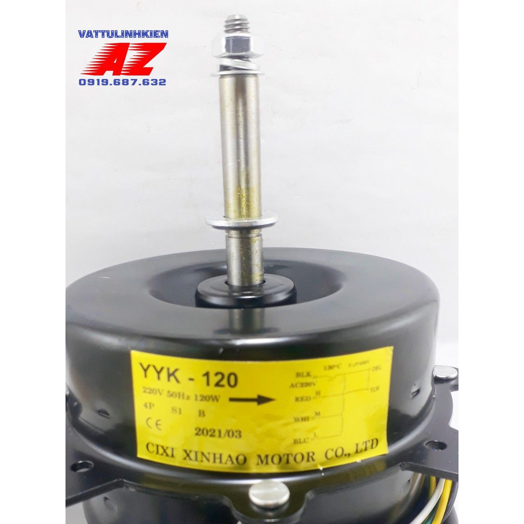 Tên sản phẩm: Motor 120w thay thế cho quạt điều hòa, quạt làm mát Xuất xứ: CHINA Kiểu: YYF120 - YYK120 Loại : Động cơ không đồng bộ, 1 pha Chứng nhận: CC, CE, ROSH Kích thước ; Chiều dài trục 75mm, đường kính trục 12mm, Đường kính motor 120mm Điện áp : 220V - 240V / 50Hz Công suất: 120W Tụ khởi động: 5uF/450VAC Chiều: ngược chiều kim đồng hồ ( Nhìn chiều mottor theo chiều mũi tên trên tem vỏ mottor). Điều khiển : 3 tốc độ Dây nghuồn : 7 đây bao gồm 2 dây nguồn, 1 dây tiếp mát , 1 dây tụ , 3 dây tốc độ, sơ đồ đấu dây có hình ảnh trên vỏ motor V max: 1350 vòng/ phút Đề nghi quí khách kiểm tra kỹ hướng quay motor để tránh nhầm lẫn khi đặt hàng