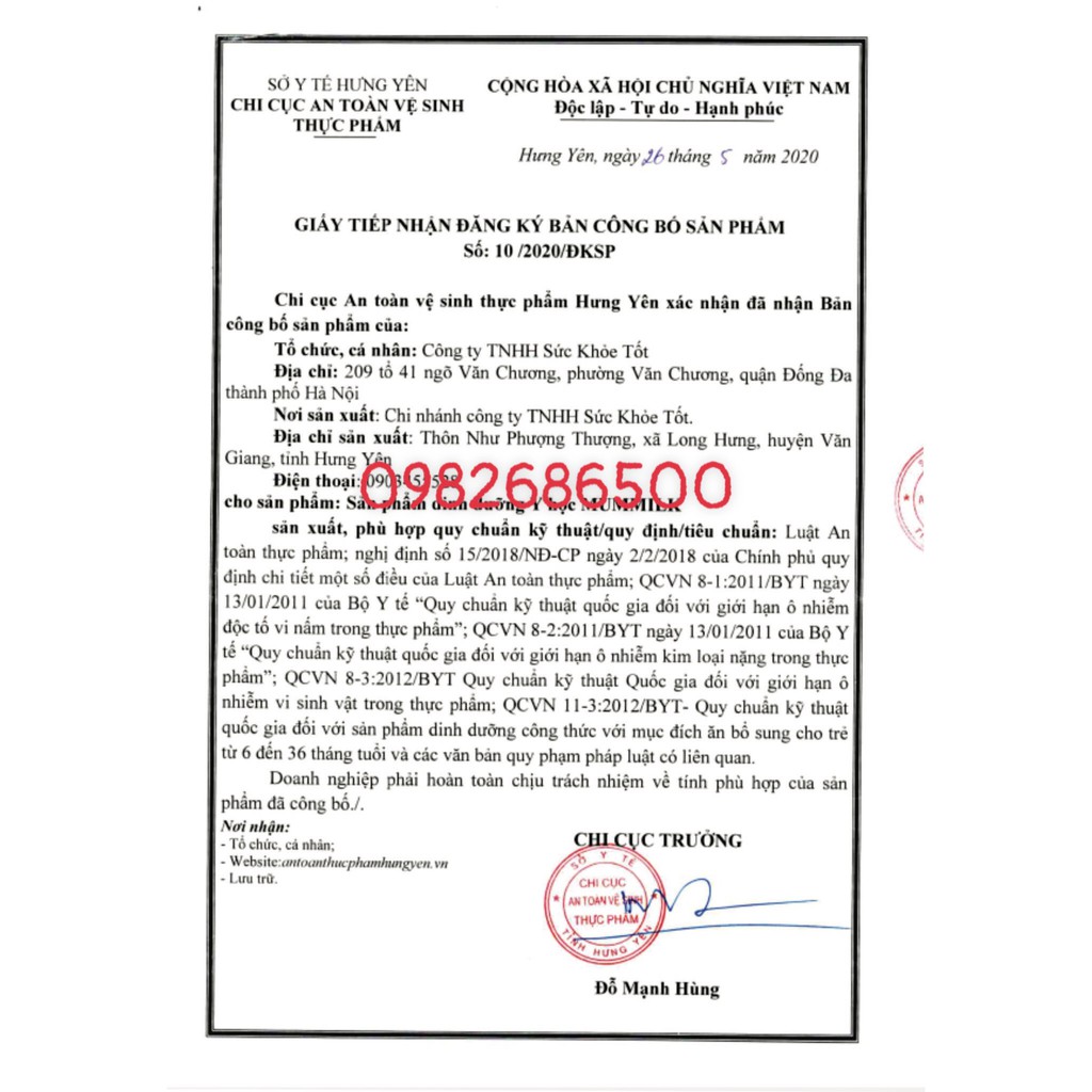 Sản phẩm được sản xuất theo công trình nghiên cứu của Viện PSTW từ năm 1965, tác dụng trên 90% chỉ sau 30 phút – 5 ngày dùng (xem ảnh chụp công trình nghiên cứu ở hình ảnh). Cốm lợi sữa Mummilk Yến sào – Tuôn trào & Đặc sánh. Ngoài ra MumMilk có thể thay thế phương pháp lợi sữa truyền thống (cháo chân giò, bột ngũ cốc…) gây tăng cân ngoài ý muốn cho mẹ. MumMilk thơm ngon, dễ sử dụng giúp Mẹ dáng thon – Con mau lớn. THÀNH PHẦN: 🌾 Cao Hạt Bông Gạo ++: tăng tiết sữa ở bà mẹ cho con bú. Giúp tuôn trào nguồn sữa mẹ. 🌾 Yến Sào: thêm dưỡng chất cho nguồn sữa mẹ, giúp sữa mẹ luôn đặc sánh. 🌾 Calci hữu cơ: Các mẹ thường thiếu Calci trước và sau sinh. MumMilk bổ sung lượng canxi cần thiết cho cả mẹ và bé. 🌾 Một số Acid Amin cần thiết. CÔNG DỤNG: - Tăng tiết sữa và chất lượng sữa ở Mẹ đang cho con bú, Mẹ sau khi sinh phải dùng kháng sinh. - Nên dùng trước khi sinh để kịp có sữa non chứa nhiều kháng thể cho bé khi chào đời. - Giảm nguy cơ tắc sữa/mất sữa/viêm tắc tia sữa. - Bổ sung vitamin, acid amin cần thiết. TẠI SAO CHỌN CỐM LỢI SỮA MUMMILK YẾN SÀO? ✅ Gọi sữa mẹ nhanh chỉ sau 30 phút - 5 ngày sử dụng. ✅ Là công trình nghiên cứu CẤP NHÀ NƯỚC của Viện phụ sản Trung Ương năm từ năm 1965 ✅ Thành phần 100% thiên nhiên. AN TOÀN khi sử dụng. ✅ Sản phẩm cam kết chất lượng "CHƯA LỢI SỮA HOÀN 100% TIỀN" ĐỐI TƯỢNG SỬ DỤNG: ✅ Phụ nữ sắp sinh nở để kịp có sữa non chứa nhiều kháng thể cho bé khi chào đời. ✅ Mẹ đang cho con bú phải dùng kháng sinh. ✅ Mẹ cho con bú có sức đề kháng kém, kém ăn, hay bị táo bón. ✅ Hỗ trợ lợi sữa, giúp tăng tiết sữa, giảm tắc sữa ở phụ nữ sau sinh. CÁCH SỬ DỤNG: - Ngày uống 2-3 lần, mỗi lần 1-2 gói cốm với khoảng 150ml nước ấm. Dùng trước ăn 30 phút. NÊN DÙNG DUY TRÌ HÀNG NGÀY ĐỂ SỮA MẸ LUÔN ĐẦY LÀ THƠM NGON SẢN PHẨM KHÔNG PHẢI LÀ THUỐC , KHÔNG CÓ TÁC DỤNG THAY THẾ THUỐC CHỮA BỆNH