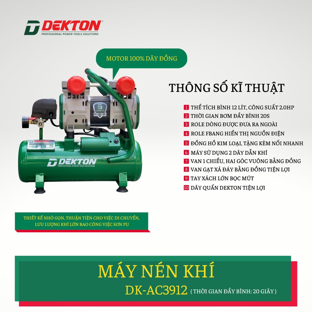 Nén Khí Không Dầu Dekton DK-AC3912 2HP/1500W/ Bình 12L - Lưu Lượng 200L/Phút Model: DK-AC3912 Thông Số Kỹ Thuật '-Công suất : 2.0HP/1500W - Điện áp : 220v/50hz - Lưu lượng: 200 lít /phút - Áp suất : 8kg/cm2 - Vòng tua : 2800 vòng/phút - THỜI GIAN : 21 GIÂY ĐẦY BÌNH : 12 lít ------------Đặc Điểm Nổi Trội : 1. Lên hơi nhanh, hai ống dẫn xuống bình 2. Hai góc vuông đồng, van 1c đồng 3. Pô e chân sắt 4. Rơle Fbang trắng 6. Có trích khí điện 7. Tay cầm đôi chắc chắn 8.Nhỏ Gọn Dễ Di Chuyển Bằng Xe Máy, Cơ Động Khí Mang Vác Đi Thi Công Nhưng Vẫn Đảm Bảo Đáp Ứng Tốt Cho Thợ Sơn PU Vì Máy Hồi Hơi Rất Nhanh 200L/PHÚT. -------------------- Bảo Hành 6 Tháng - Địa chỉ bảo hành: CTY TNHH THANH XUÂN NAM 154 Lý chiêu hoàng, P10, Q6, TPHCM