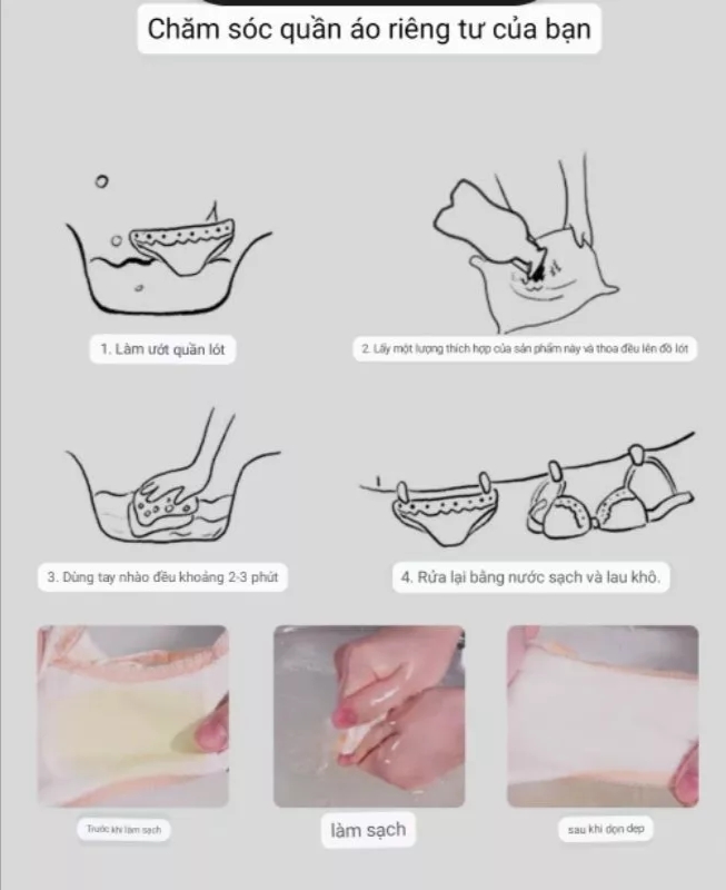 HƯỚNG DẪN SỬ DỤNG ️ Cách 1- Giặt trực tiếp: Vò đồ lót trực tiếp với nước giặt đồ lót . Xả lại bằng nước sạch️ Cách 2- Ngâm: Làm ướt đồ lót. Cho trực tiếp nước giặt lên vết bẩn, thoa nhẹ để nước giặt ngấm vào vết bẩn, rồi để khoảng 30 phút. Sau đó vò trực tiếp và xả lại bằng nước sạch.