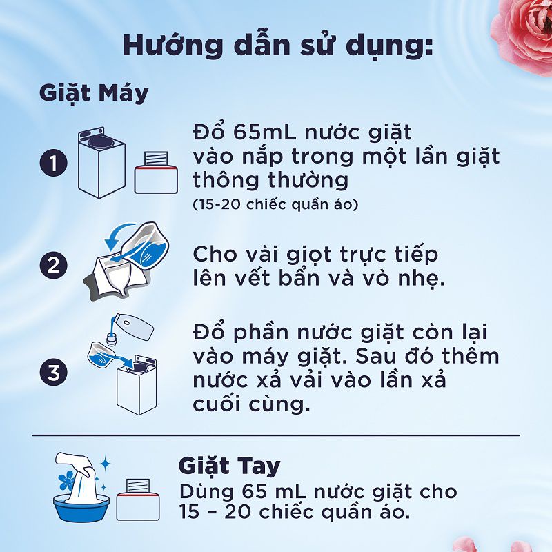 MỚI! DOWNY nay đã có NƯỚC GIẶT! Đặc điểm nổi bật: - Nước giặt Hương nước hoa với Hương thơm bền lâu nổi tiếng của Downy cho Hương thơm tươi mát bạn có thể thấy rõ trong khi giặt, sau khi phơi, và theo từng cử động (+thêm nước xả vải Downy để có trải nghiệm hương thơm xuất chúng và làm mềm mại vải) - Công nghệ làm sạch sinh học BioClean Nước giặt Downy có khả năng làm sạch với công nghệ giặt sinh học BioClean, tấn công các vết bẩn thấm sâu trong từng lớp vải Nước giặt DOWNY là sự lựa chọn hoàn hảo cho bạn. - Nước giặt DOWNY để lại Hương thơm dễ chịu và bền - Nước giặt DOWNY làm sạch vết bẩn vượt trội - Công thức bọt tối ưu phù hợp sử dụng cho máy giặt, bao gồm cả cửa trên và cửa trước. Hướng dẫn sử dụng: Đổ Nước giặt DOWNY vào nắp với liều lượng theo hướng dẫn. Với vết bẩn cứng đầu, thoa một lượng nhỏ Nước giặt DOWNY trực tiếp lên vết và vò nhẹ. Đổ phần Nước giặt DOWNY còn lại trong nắp vào máy giặt cùng quần áo. Sau đó thêm nước xả vải vào lần xả cuối cùng. Giặt máy: 65mL cho 1 lần giặt thông thường (15-20 chiếc quần áo). Đối với lượng quần áo nhiều hơn hoặc bẩn hơn, nên tăng liều lượng nước giặt tương ứng thành 1.5 nắp. Giặt tay: 15mL cho 4-6 chiếc quần áo. 65mL cho 15-20 chiếc quần áo. LƯU Ý: ĐỂ XA TẦM TAY TRẺ EM! Không được nuốt. Nếu nuốt phải sản phẩm, hãy gọi tham vấn bác sĩ. Tránh để dính vào mắt. Nếu dính vào mắt, hãy rửa kỷ HSD: 3 năm kể từ ngày sản xuất in trên bao bì