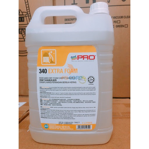 Hóa chất giặt thảm Goodmaid G340-Extrafoam can 5L là hoá chất giặt thảm đậm đặc chất lượng cao, tạo bọt, làm sạch, bảo dưỡng cho các loại thảm. Hướng dẫn sử dụng - Có thể sử dụng để giặt thảm bằng tay. - Dùng giặt với máy chà sàn. Pha với nước theo tỉ lệ 1:5 - Quy cá