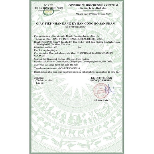 * Thành Phần Chính và Công Dụng: Nước Hồng Sâm HongsamJin Gold với chiết xuất Hồng Sâm 6 năm tuổi, kết hợp với Nhung Hươu cùng các thành phần bổ dưỡng cao cấp, tạo nên công thức hỗ trợ nâng cao sức khỏe và hỗ trợ giảm mệt mỏi hiệu quả. - Đối tượng sử dụng : Trẻ em trên 3 tuổi và người lớn. - Hỗ trợ nâng cao sức khỏe, giảm mệt mỏi. * Hướng Dẫn Sử Dụng: Ngày uống 1 chai. Dùng uống trực tiếp, ngon hơn khi uống lạnh. Ngoài ra, có thể dùng sản phẩm HONGSAMJIN GOLD khi có nhu cầu bồi bổ cho cơ thể hoặc tiếp năng lượng Chú ý : Thực phẩm này không phải là thuốc, không có tác dụng thay thế thuốc chữa bệnh. * Xuất xứ Hàn Quốc * Hướng dẫn sử dụng Xem hướng dẫn sử dụng trong phần thông tin chi tiết của sản phẩm Thành phần Chiết xuất Hồng sâm,Taurine,chiết xuất nho tàu,chiết xuất quế,chiết xuất gừng khô,chiết xuất nấm linh chi,chiết xuất gạc hươu,chiết xuất táo tàu,hương vị thực phẩm(hỗn hợp thảo dược và nhân sâm),citric acid,nước tinh khiết,fructo-oligosaccharide,.... Điều kiện bảo quản Bảo quản nơi khô mát, tránh ánh nắng mặt trời